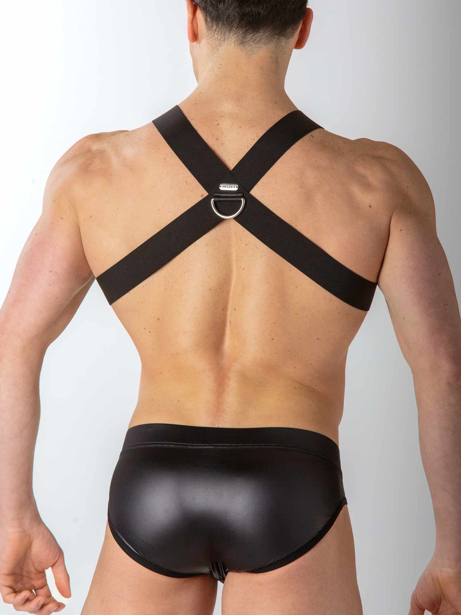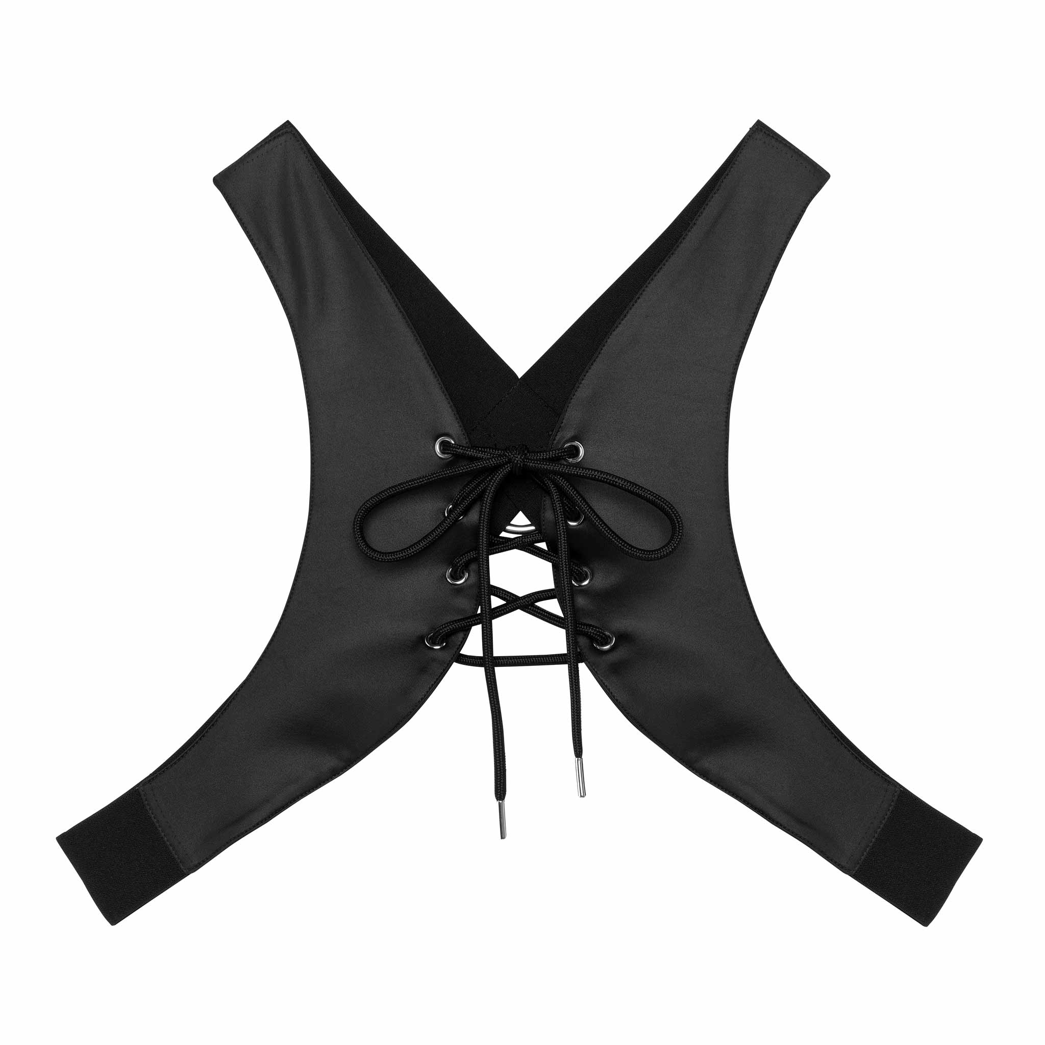 Le harnais Night Universe de WOH s’adresse aux hommes qui veulent se démarquer. Fabriqué en tissu vinyle noir à effet cuir, il dégage une allure audacieuse et dominante. Le laçage réglable à l’avant permet un ajustement parfait, tandis que les bretelles croisées élastiques avec anneau métallique au dos renforcent le style affirmé. Parfait pour les nuits en club ou les moments intimes chargés de tension.