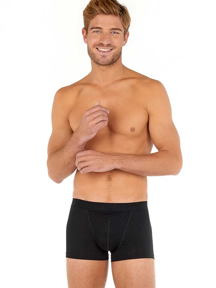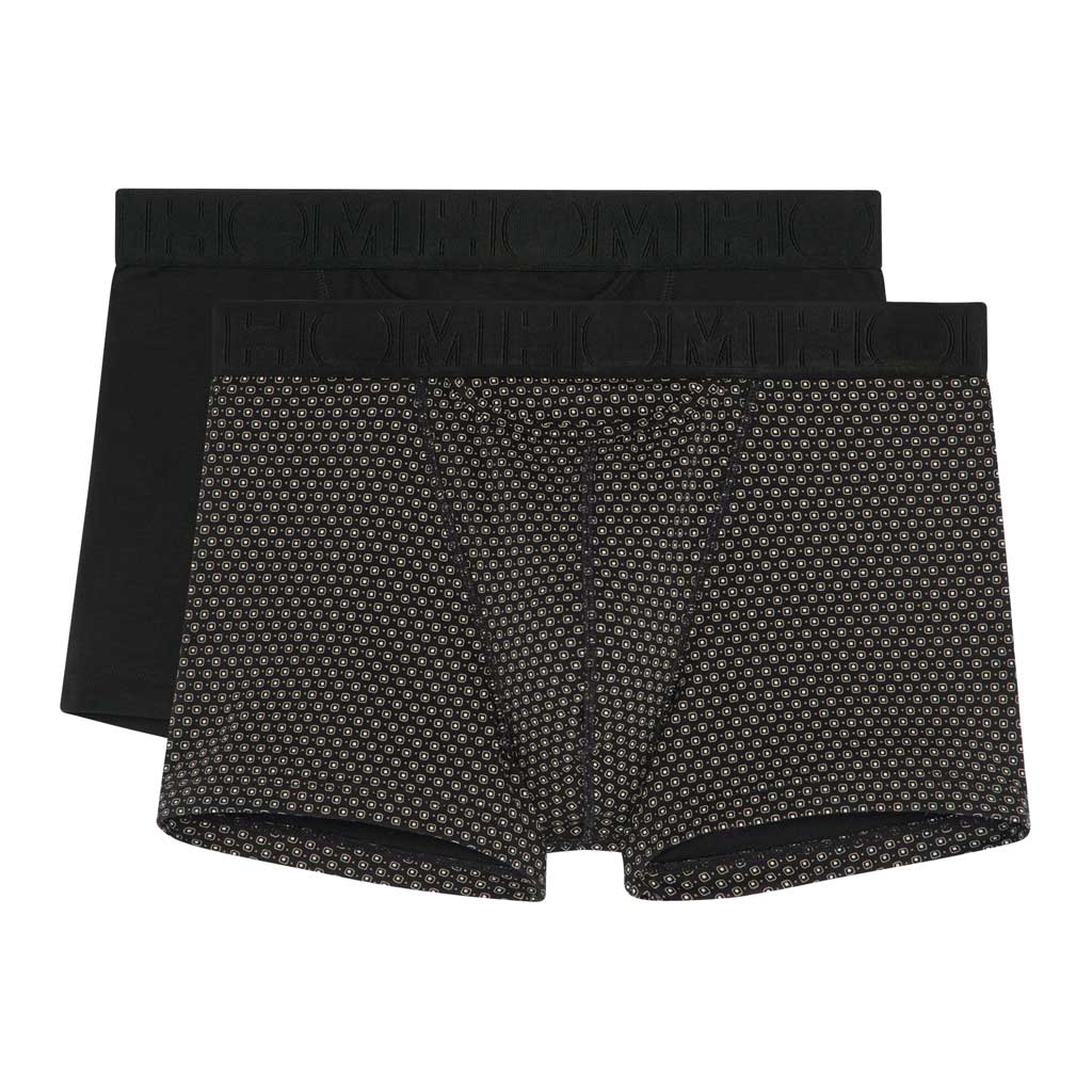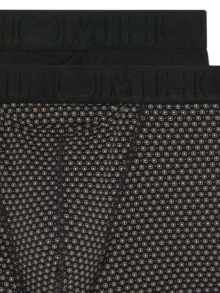 Lot avantaguex de deux boxers qui font partie de la collection Boxerlines d'HOM. Les boxers de cette collection sont fabriqués en coton tissé avec un peu d'élasthanne. Voilà pourquoi ils sont hyper doux et ils sont toujours confortables à porter. Le lot 'Gauthier' se compose d'un boxer en couleur uni et un autre avec un micro-imprimé noir et gris.