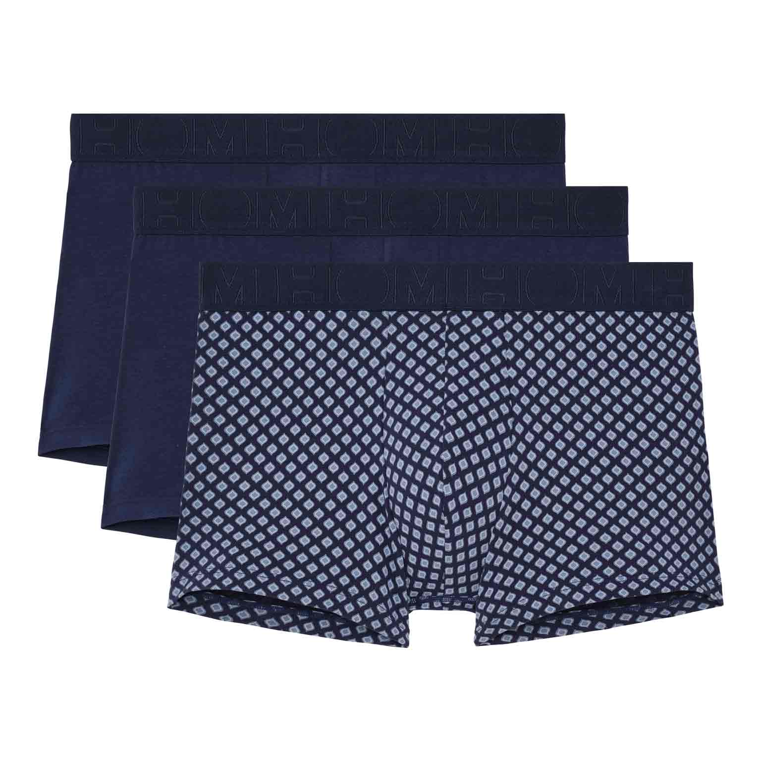 Ce pack contient deux boxers bleu marine unis et un modèle avec un micro-imprimé raffiné façon cravate. La ceinture élastique classique est ornée d’un logo HOM discret tout autour. Une base confortable avec une touche d’élégance.