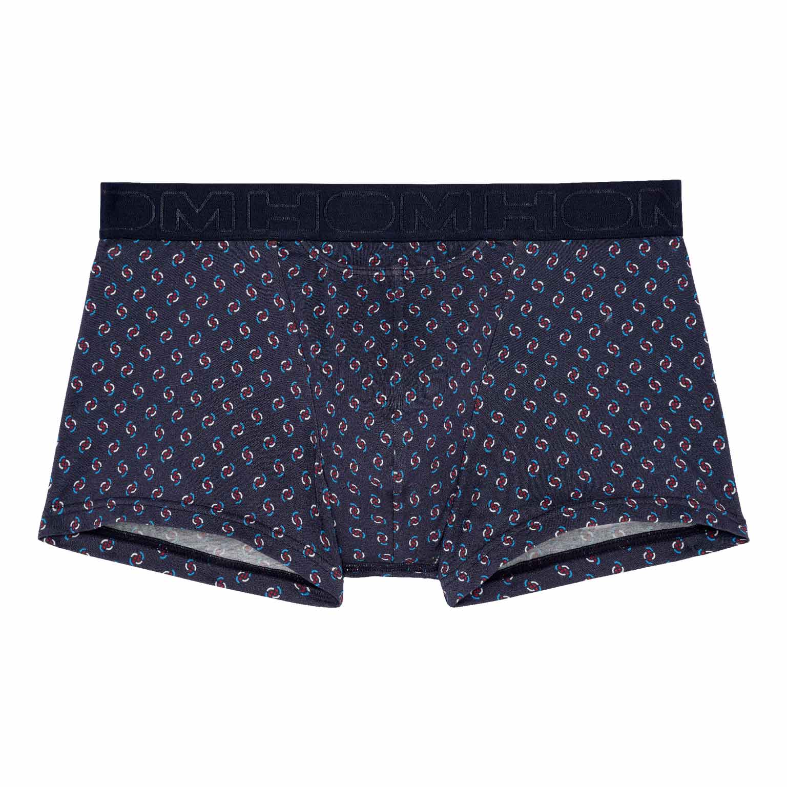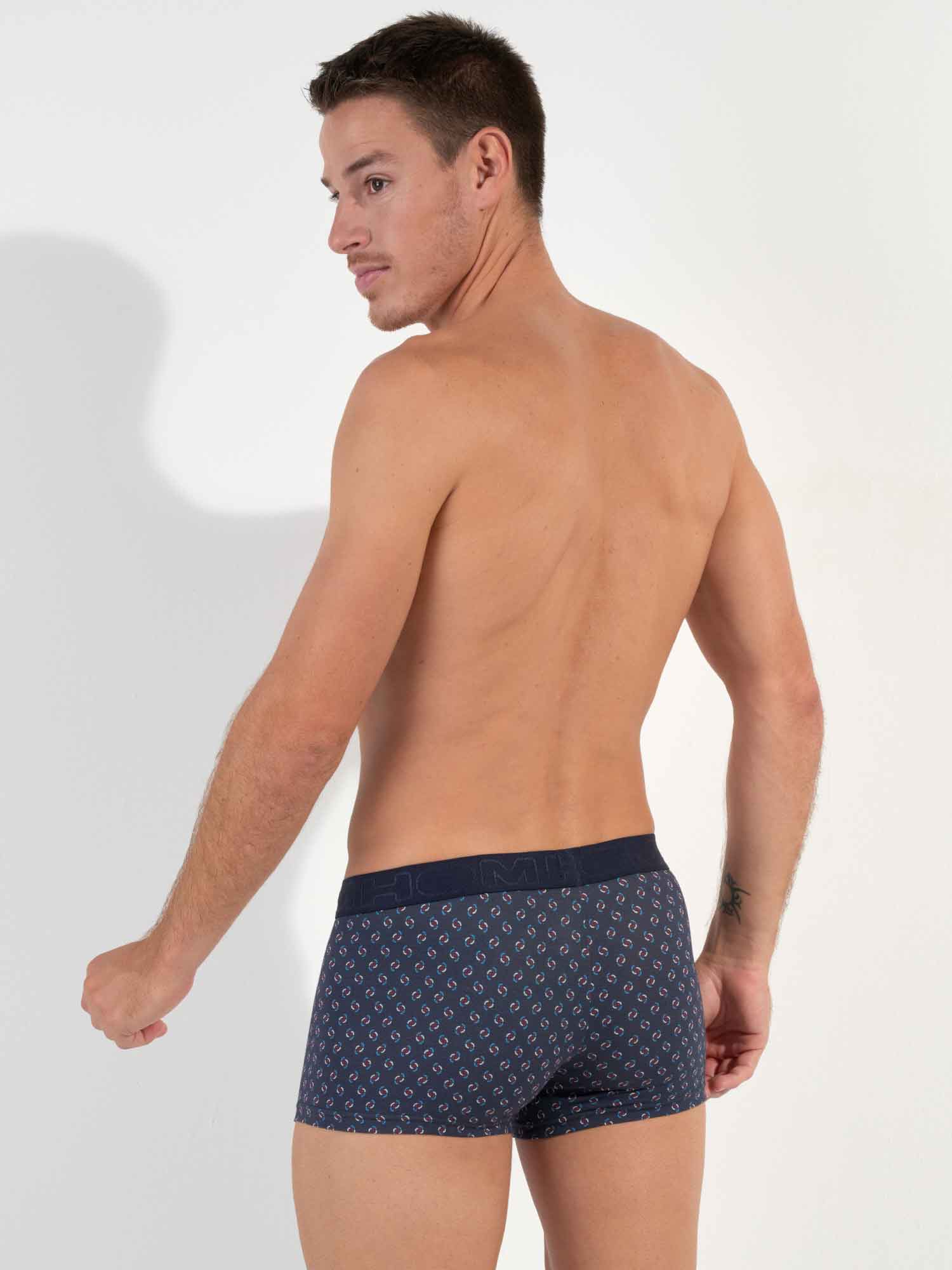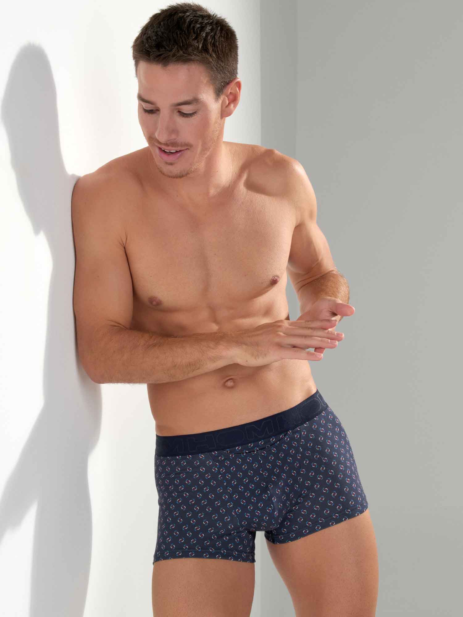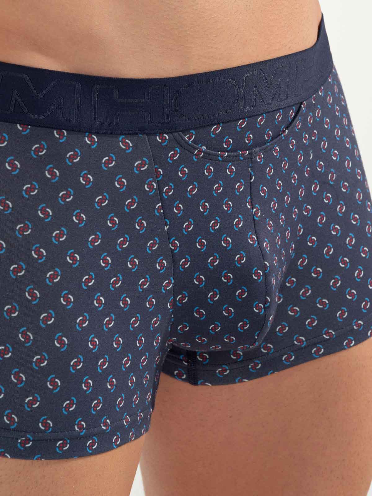 Le Cyrus - HO1 Boxer Briefs est fabriqué en coton modal et dispose de l'‘ouverture horizontale’, la braguette spéciale pour un confort supplémentaire, pour laquelle HOM est connu. Ce boxer pour hommes arbore un motif tricolore unique sur un fond bleu marine. Le Cyrus est conçu avec une ceinture élastique en coton qui repose confortablement contre la peau. La ceinture présente le logo HOM tout autour.