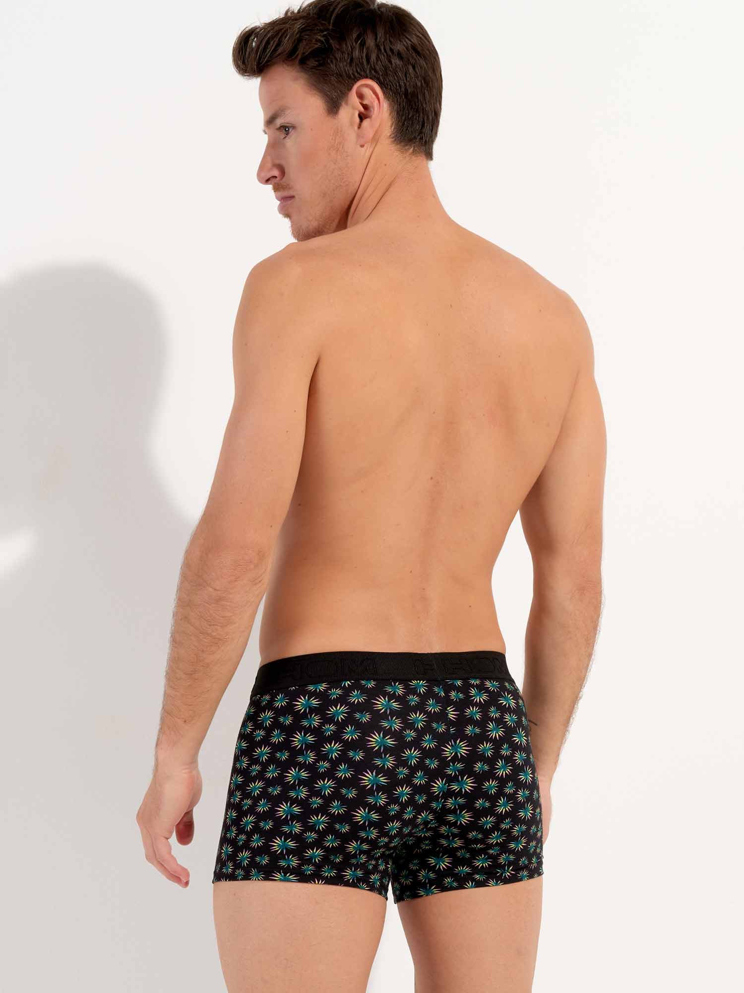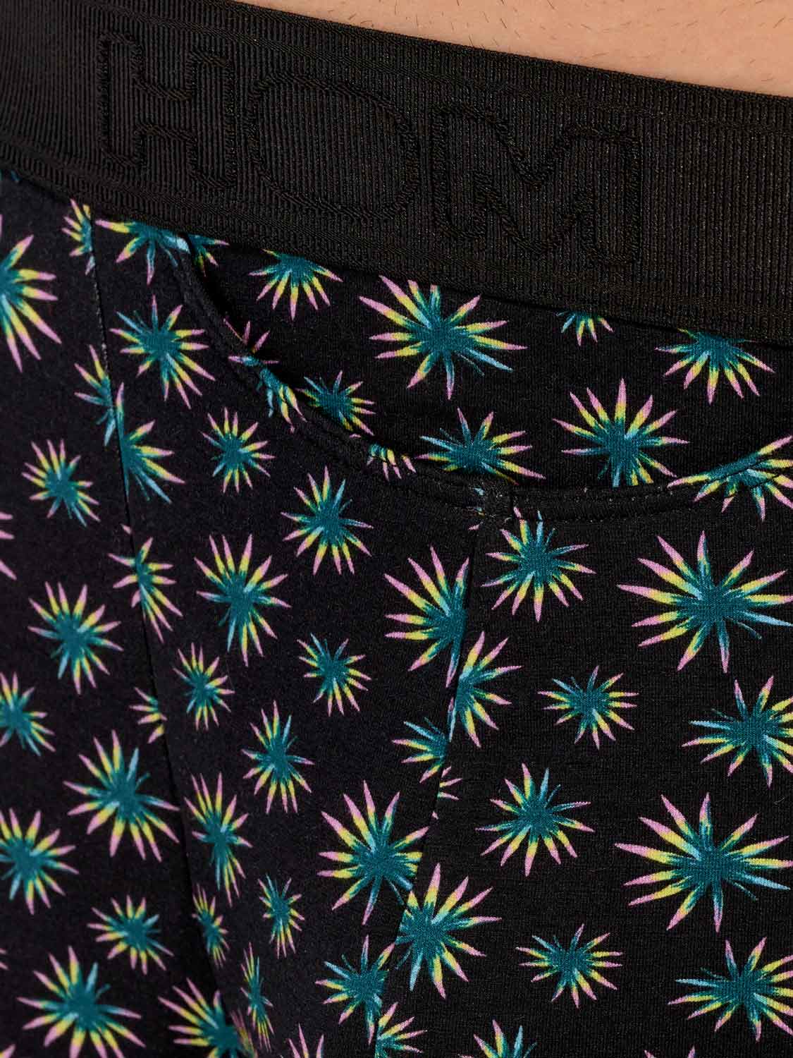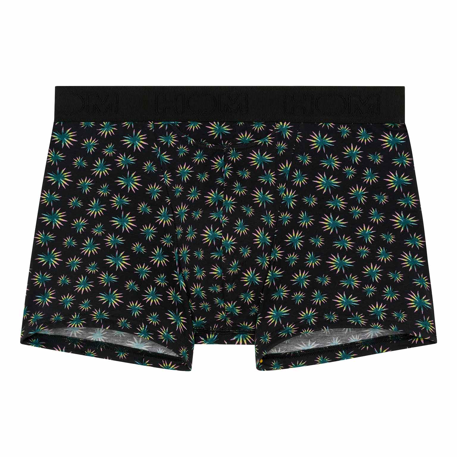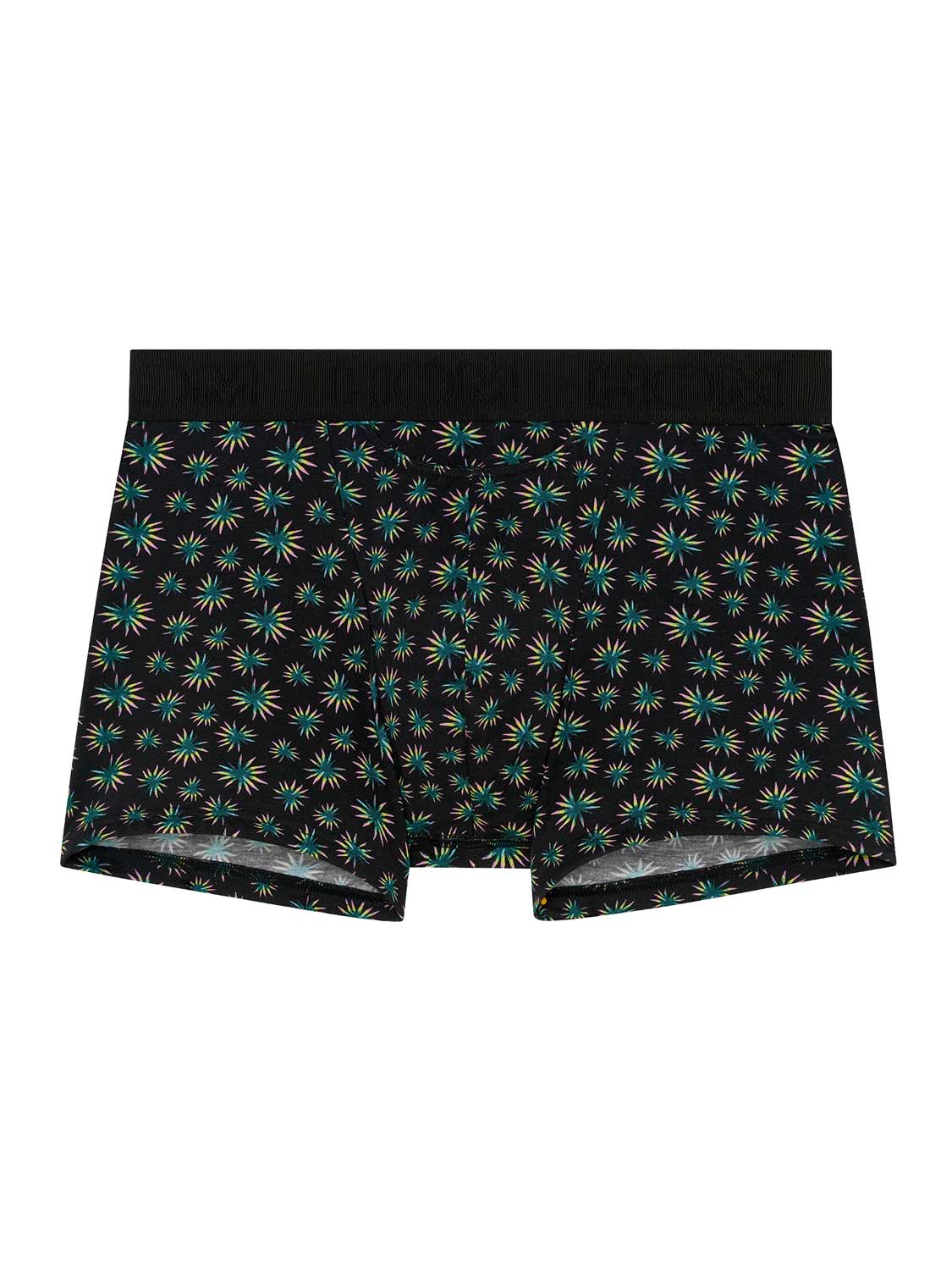 Les Dizzy - HO1 Boxer Briefs sont fabriqués en coton-modal et disposent de l'ouverture horizontale, la braguette emblématique de HOM pour plus de confort. Ces boxers pour homme arborent un micro-imprimé botanique abstrait avec des feuilles de palmier vertes, jaunes et roses sur un fond noir. Les Dizzy sont dotés d'une ceinture élastique côtelée avec le logo HOM brodé en ton sur ton.