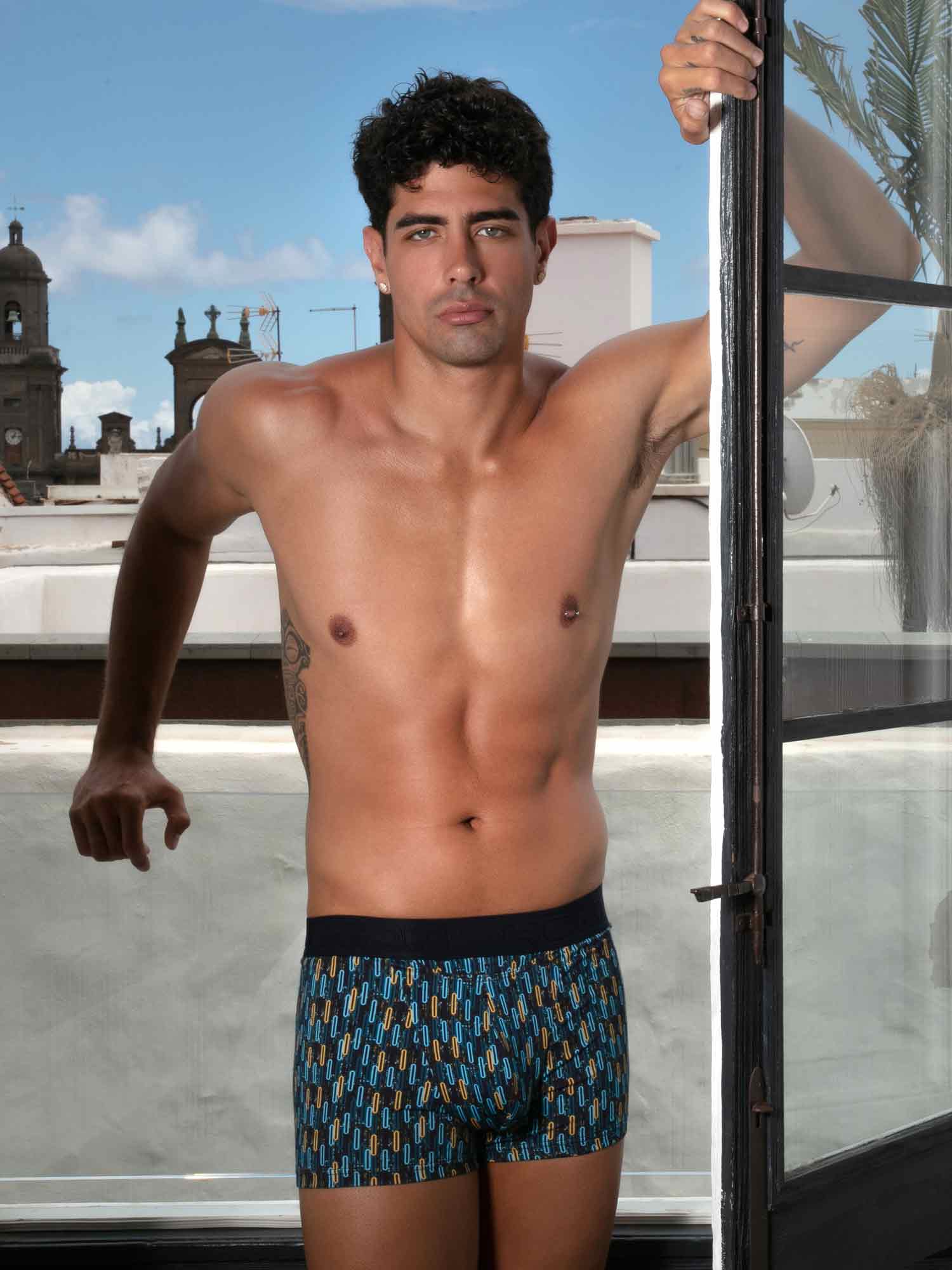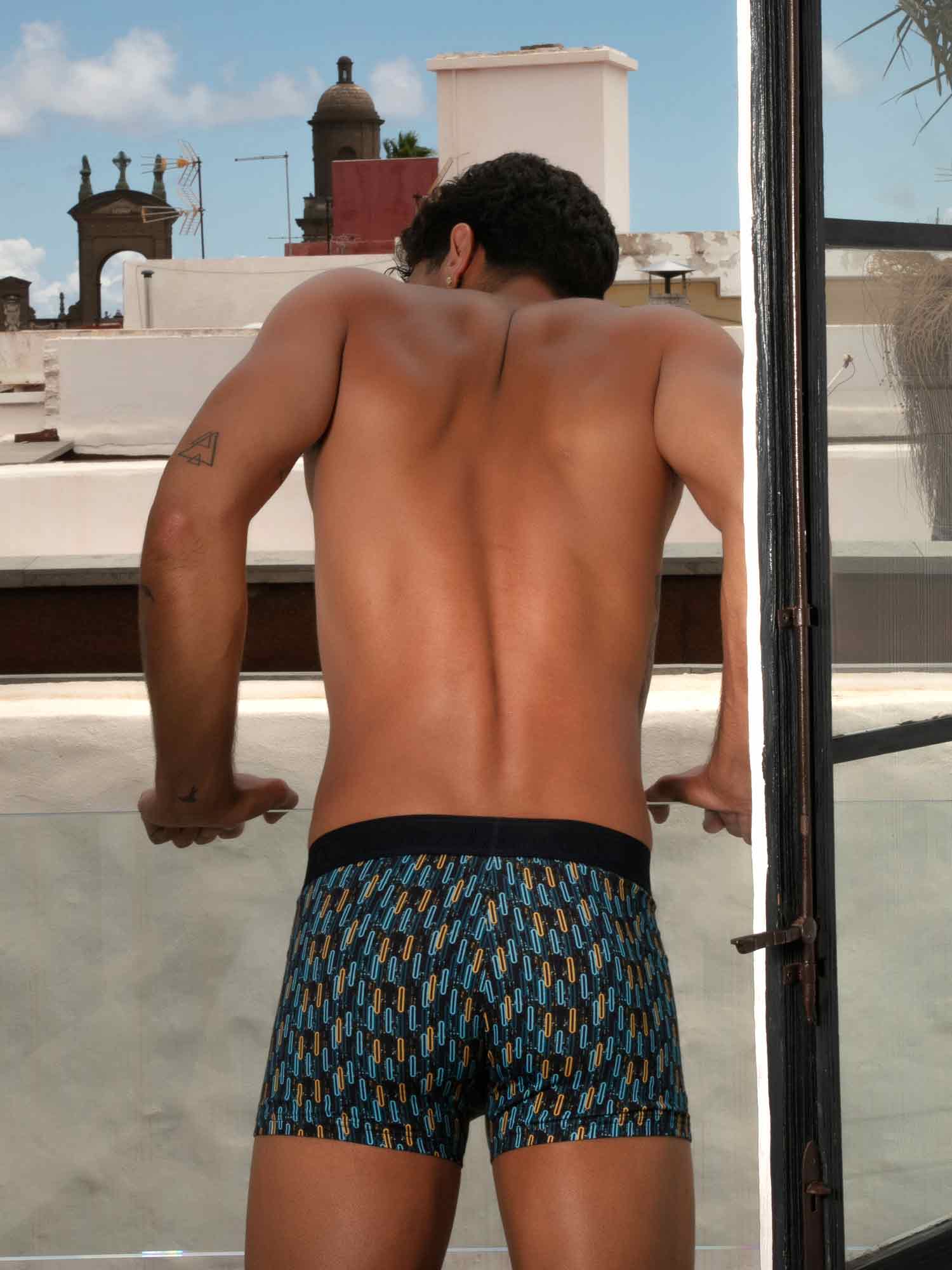 Les boxer briefs HOM Westgate HO1 célèbrent l’audace visuelle avec un imprimé rétro inspiré du Las Vegas des années 50. Les motifs ovales contrastés en bleu et jaune sur fond bleu marine évoquent l’american modernism et l’art géométrique de l’époque. La matière de qualité, mélange de coton, modal et élasthanne, est douce, souple et résistante au quotidien. L’ouverture HO1 brevetée, aussi appelée fly horizontale, offre un confort ergonomique et un accès facile pour droitiers comme gauchers. Un renfort élastique discret à l’avant assure un ajustement naturel et précis, tandis qu’un empiècement anti-remontée au bas de jambe aide à maintenir le tout en place toute la journée. Finition par une ceinture avec logo HOM, une pièce forte au confort premium.