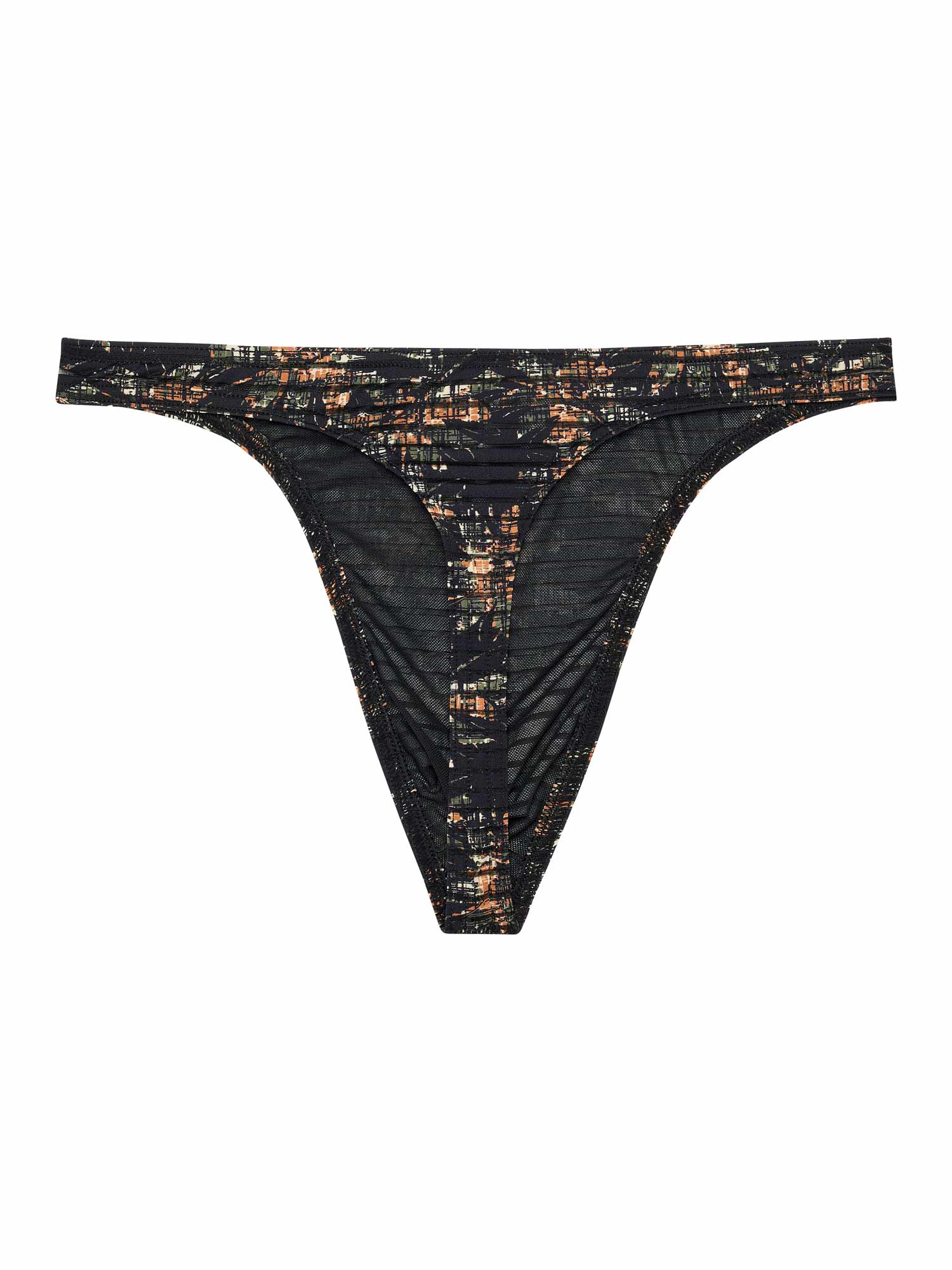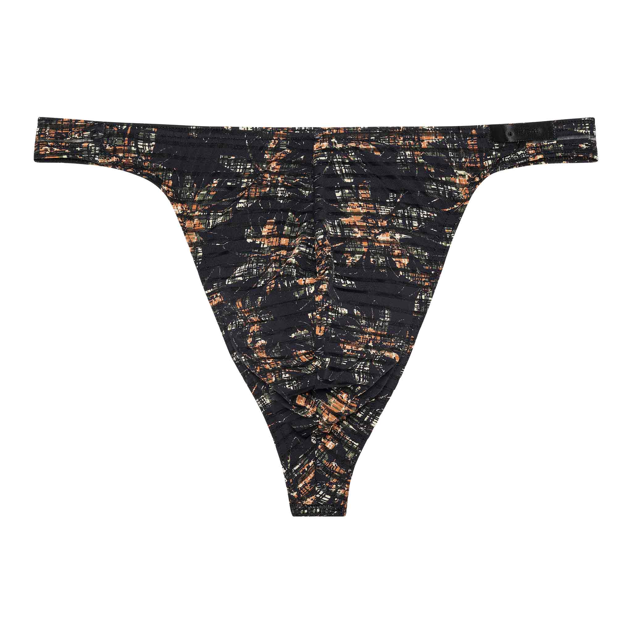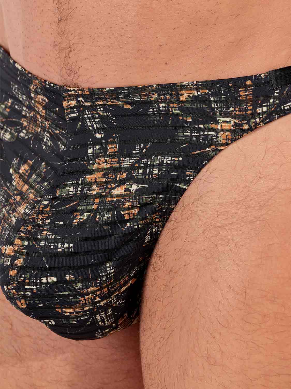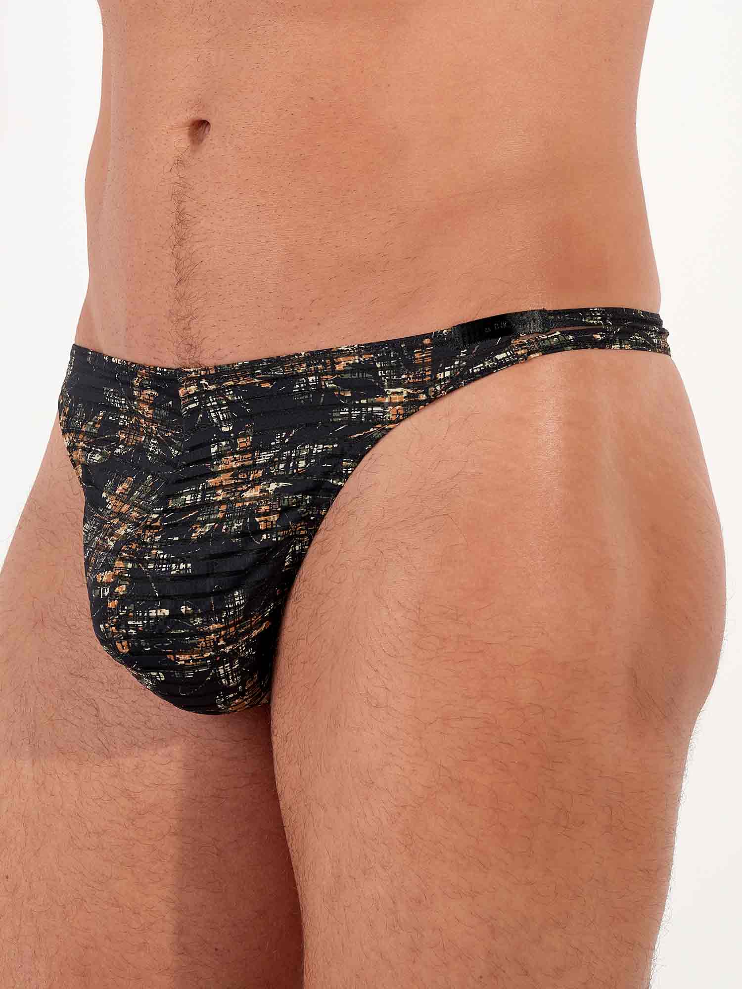 Le string Iraty de la collection HOM Temptation joue sur les contrastes avec sensualité. Un imprimé camouflage audacieux mêlé à des motifs floraux en vert et ocre parcourt une microfibre rayée semi-transparente, créant un effet visuel troublant. La matière ultralégère épouse le corps comme une seconde peau, tandis que la poche doublée assure un confort optimal et une silhouette flatteuse. Un modèle provocant pour l’homme qui séduit avec assurance.