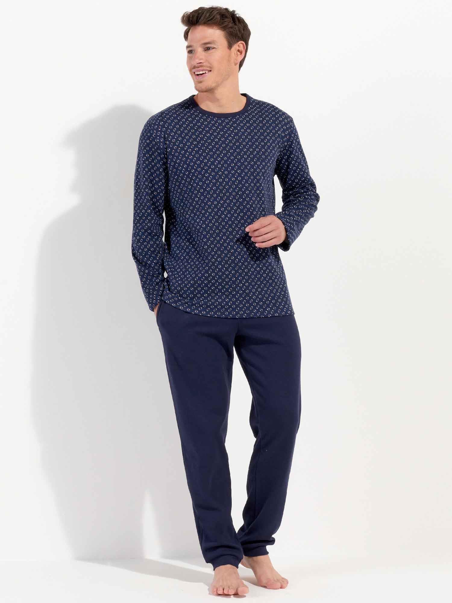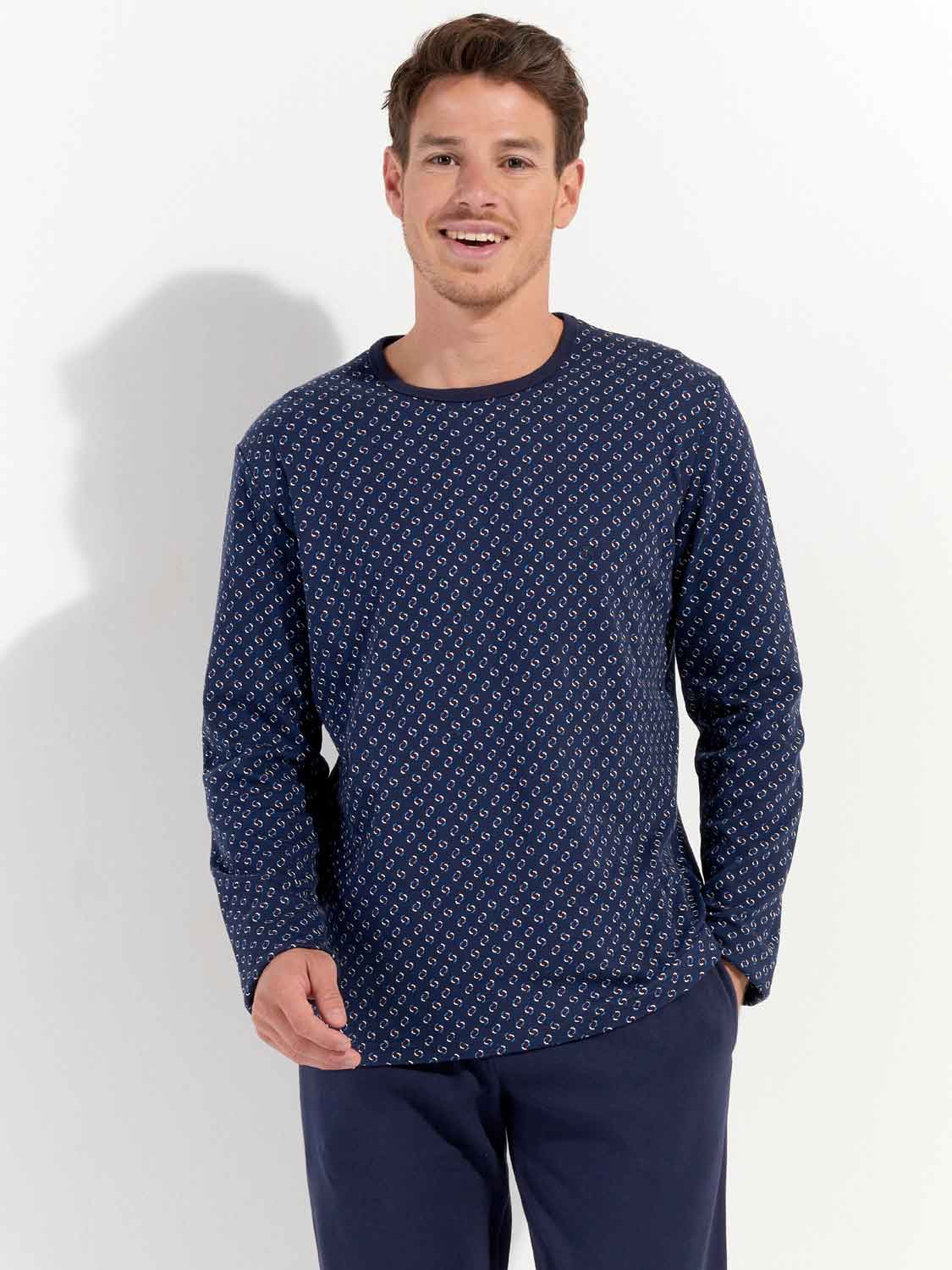Le Cyrus - Long Sleepwear est fabriqué à partir de 100% coton, tricoté avec un point interlock. Le pyjama se compose d'un t-shirt à manches longues avec un col rond. Le pantalon long est bleu marine uni, avec des poches dans les coutures à gauche et à droite. Le pantalon long a un cordon de serrage pour ajuster la taille parfaitement. Le t-shirt présente un imprimé géométrique en trois couleurs sur un fond bleu marine.