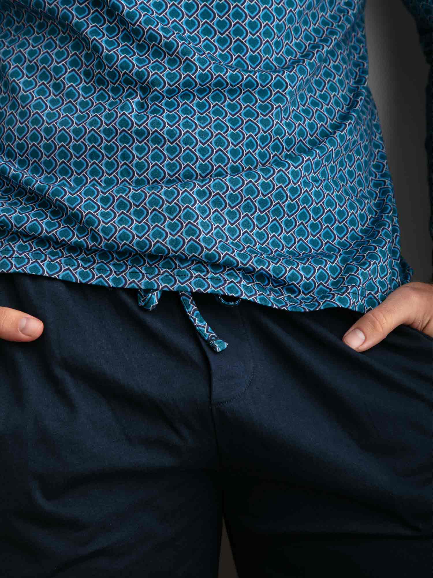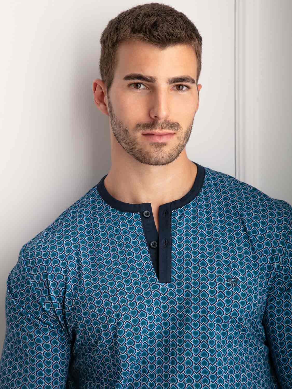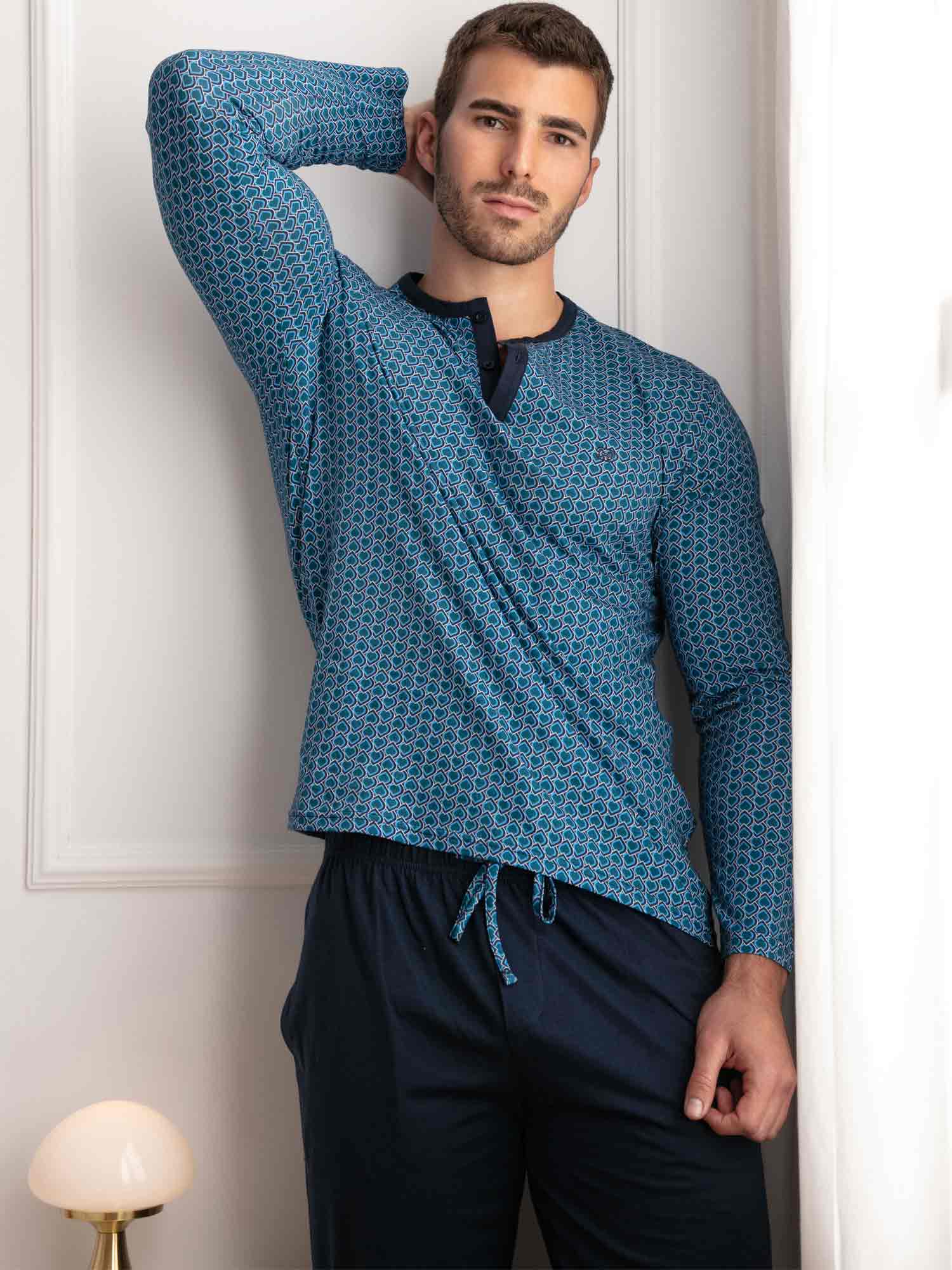Le pyjama long Martinez de HOM rend hommage aux lignes élégantes de la période Art déco. Le motif graphique en écailles bleues et turquoise, inspiré des ornements égyptiens, apporte une touche à la fois sophistiquée et originale. Le col tunisien et la patte de boutonnage contrastée renforcent son élégance. Confectionné en coton 100 %, il est doux au toucher et garantit un confort optimal. Parfait pour des soirées paisibles et des nuits de détente.