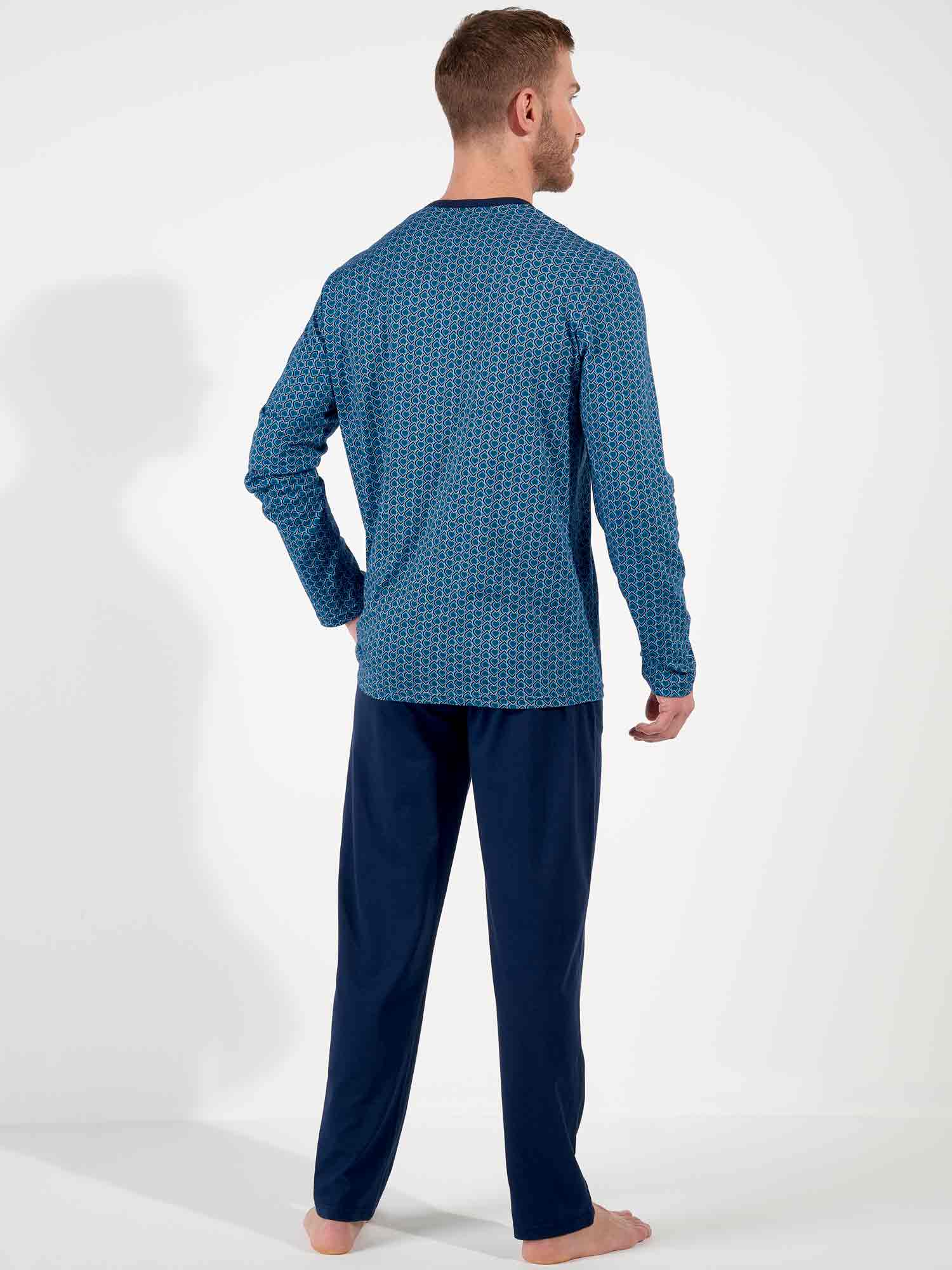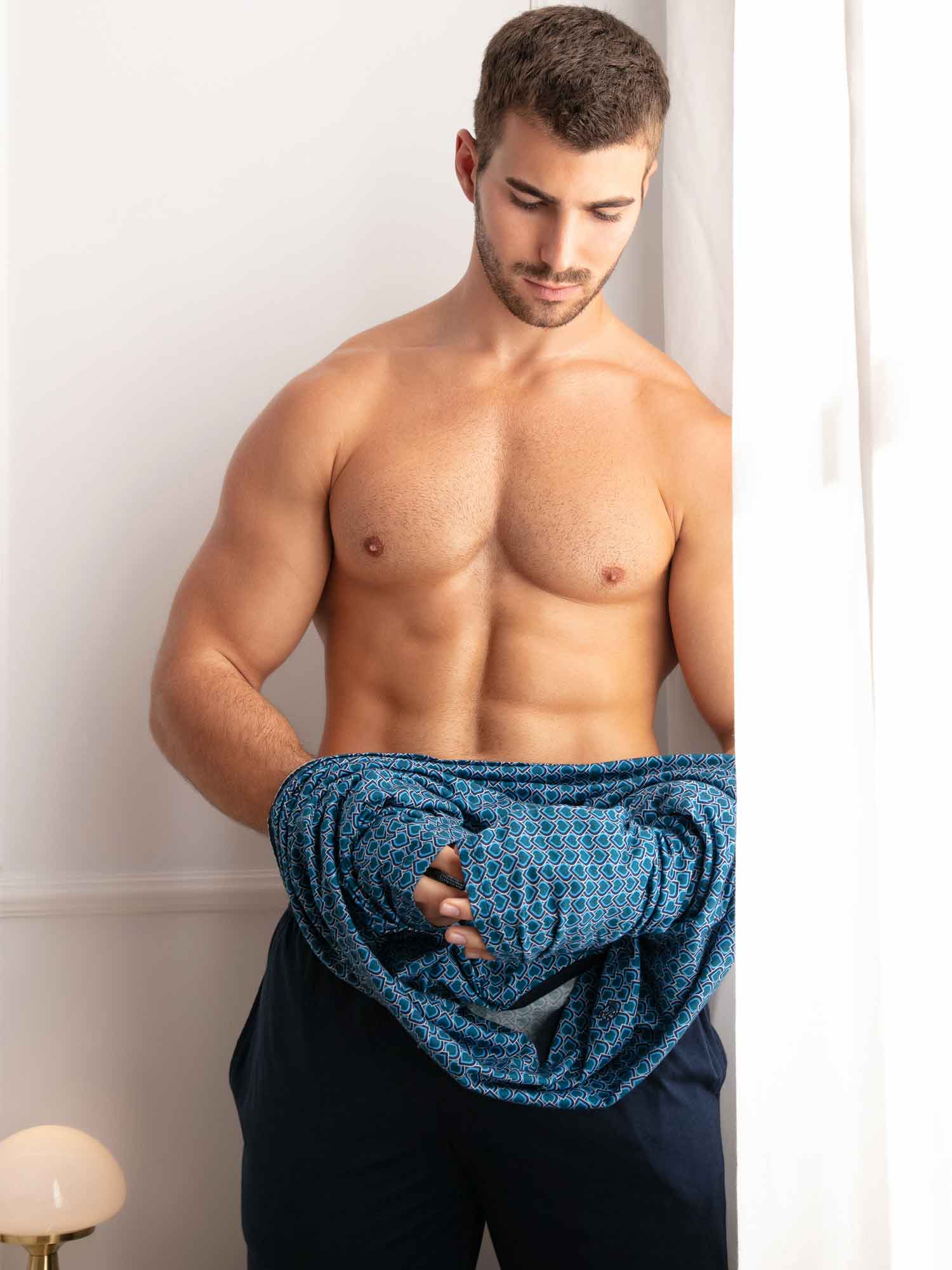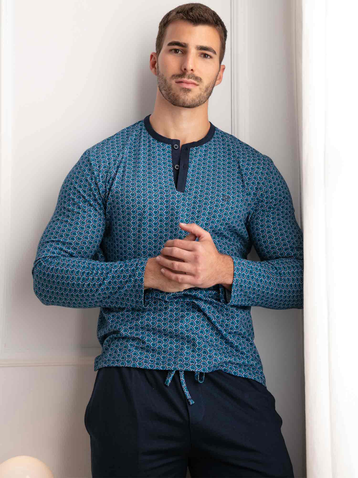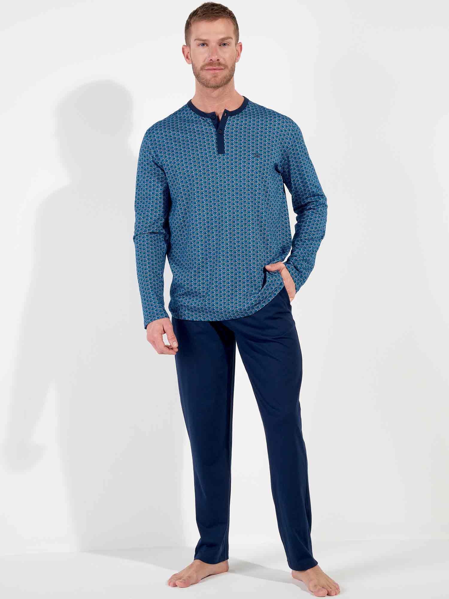 Le pyjama long Martinez de HOM rend hommage aux lignes élégantes de la période Art déco. Le motif graphique en écailles bleues et turquoise, inspiré des ornements égyptiens, apporte une touche à la fois sophistiquée et originale. Le col tunisien et la patte de boutonnage contrastée renforcent son élégance. Confectionné en coton 100 %, il est doux au toucher et garantit un confort optimal. Parfait pour des soirées paisibles et des nuits de détente.