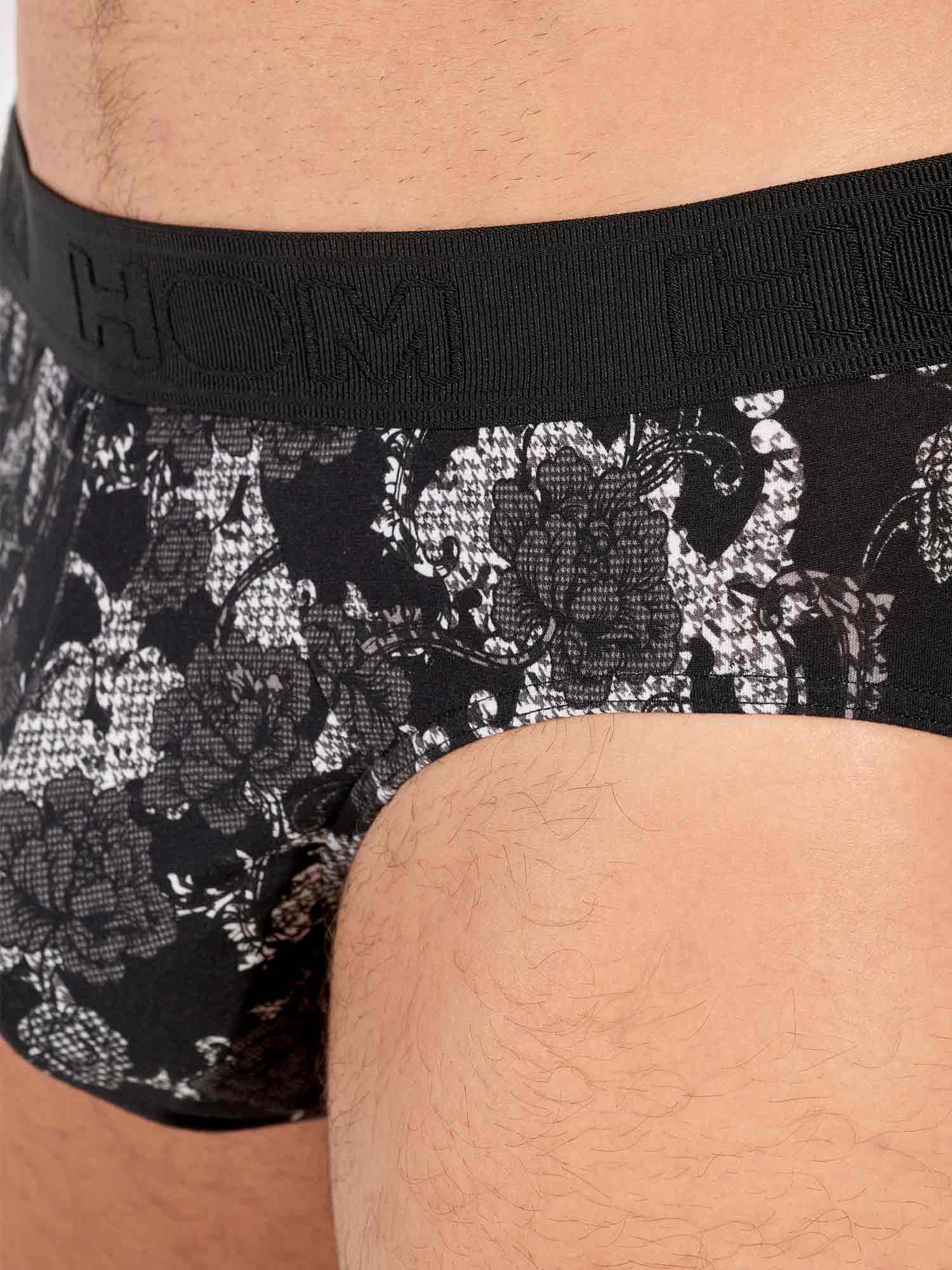 Fairmont – mini slip de HOM allie raffinement et confort ultime. Le mélange luxueux de coton et modal est agréable au toucher et très respirant. Le tissu jacquard élégant présente un motif floral subtil sur un motif pied-de-poule graphique en noir et gris. Grâce à ses finitions élastiquées, ce mini slip épouse parfaitement les formes, tandis que la coque doublée assure un excellent maintien. Pour l’homme moderne soucieux du détail.