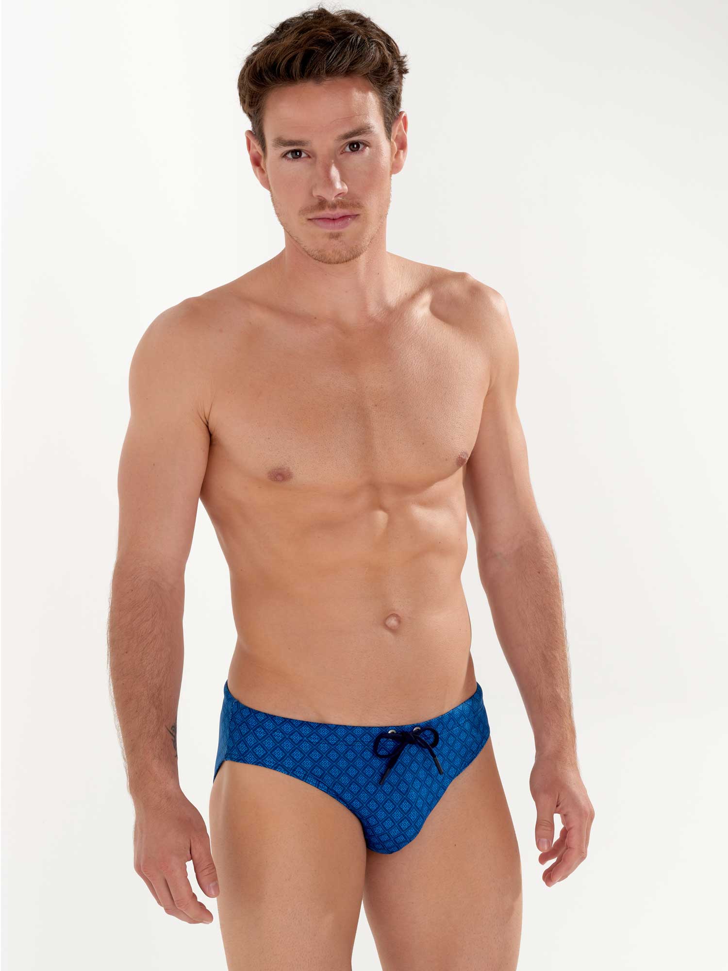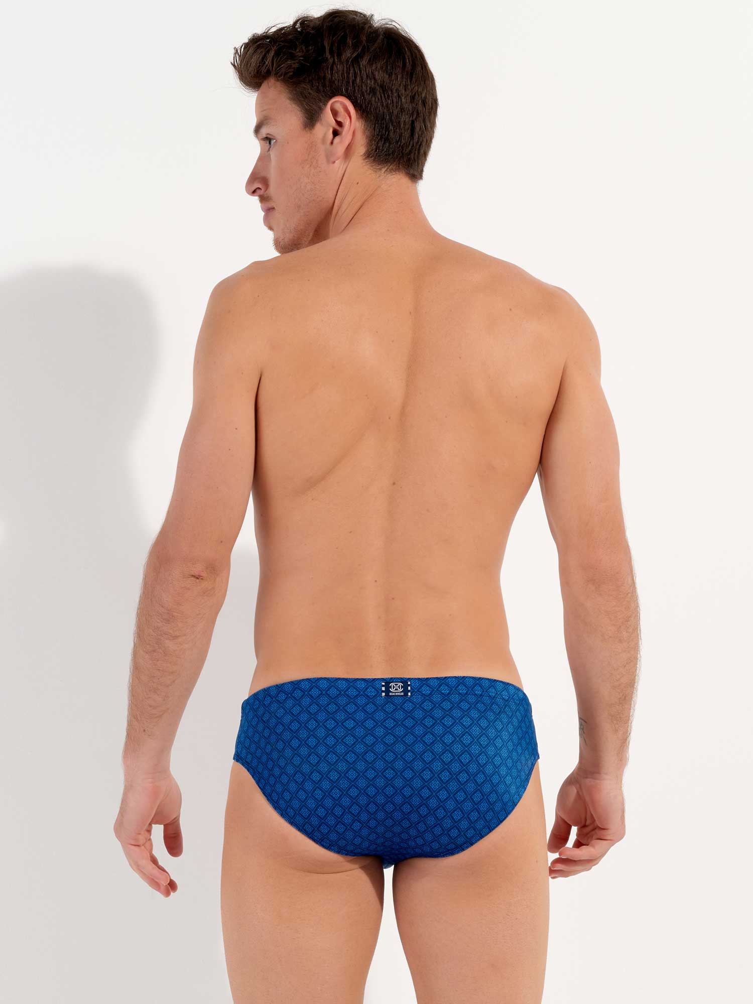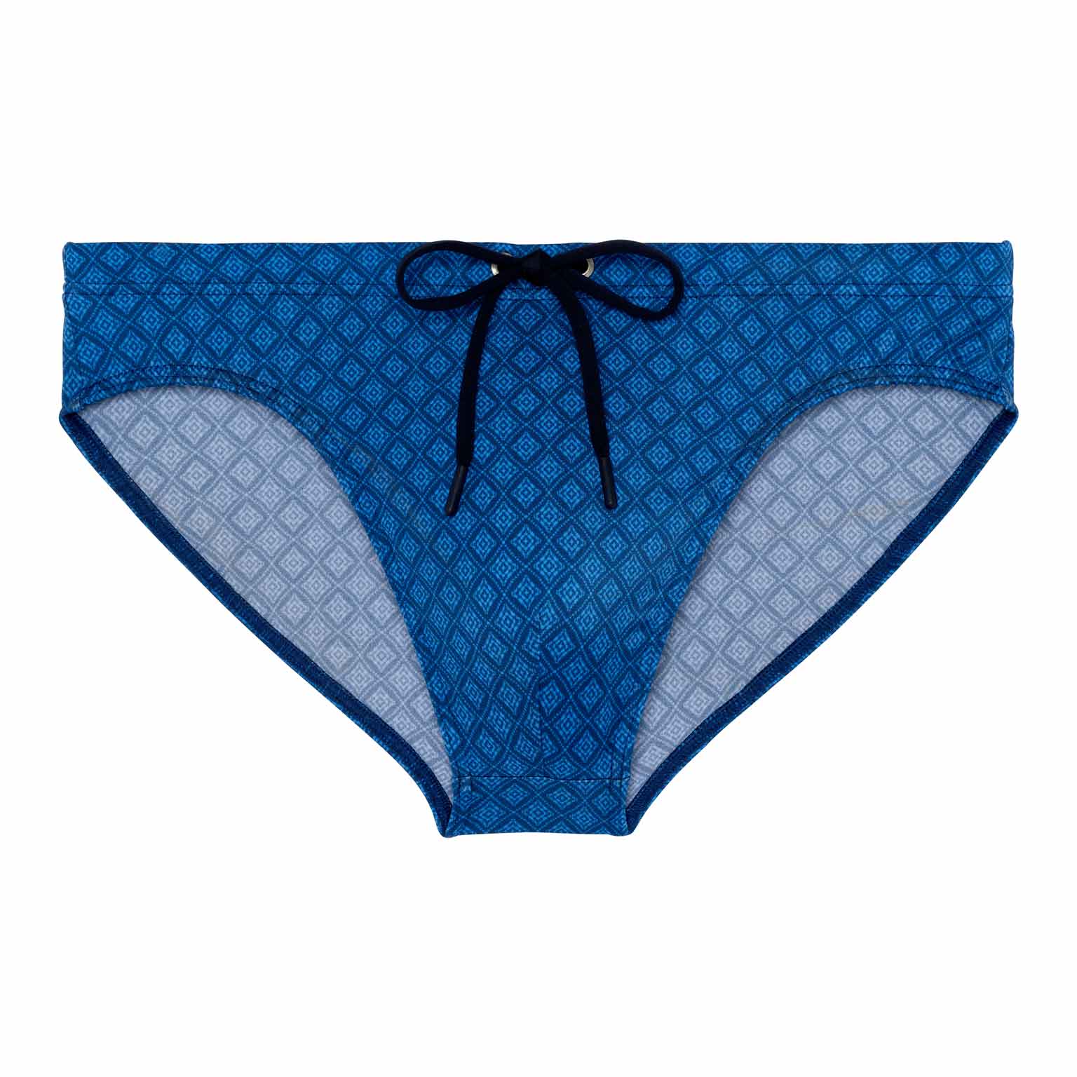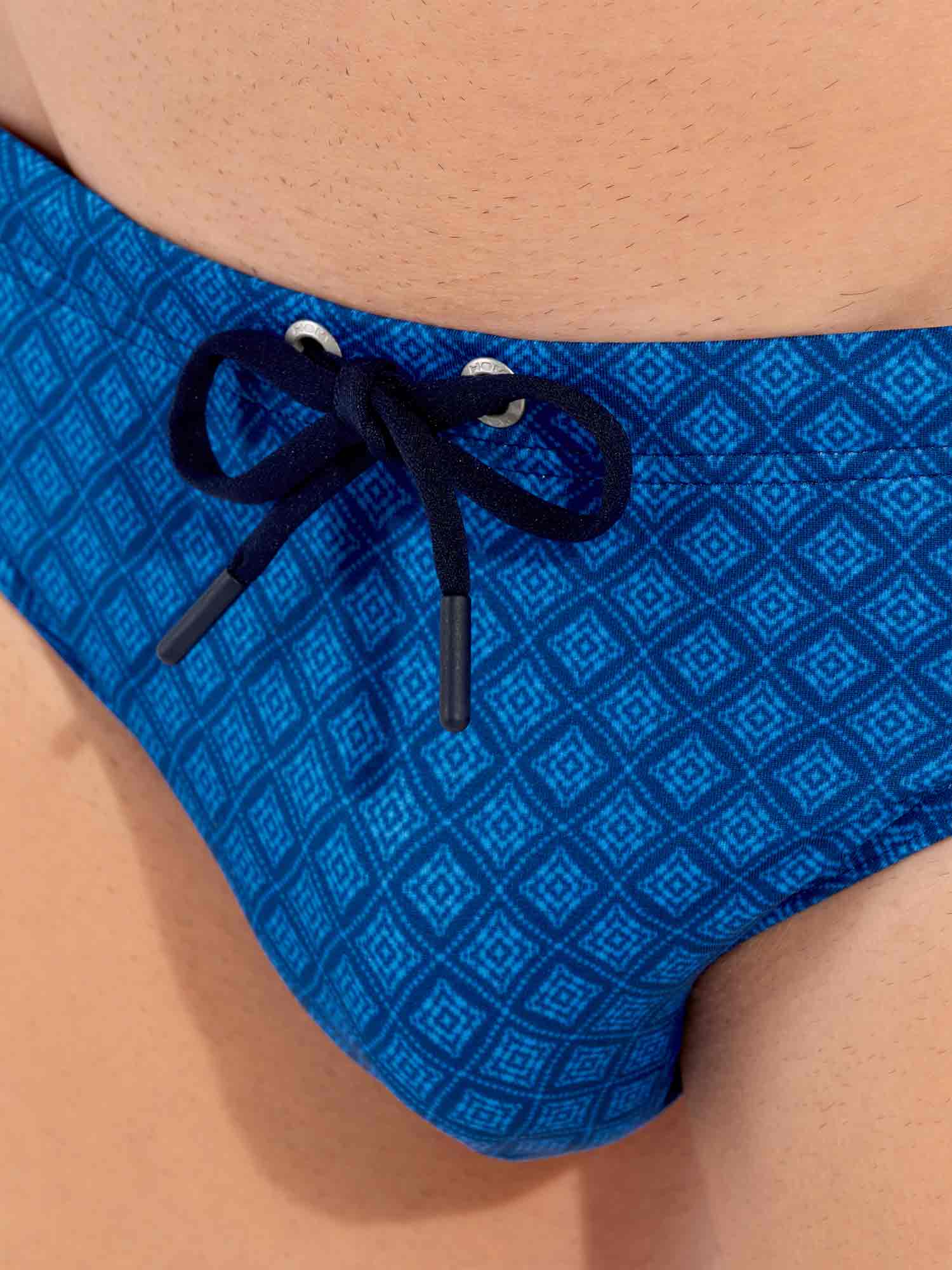 Les Hendaya - Swim Mini Briefs font partie de la collection de maillots de bain d'été de HOM. Motif élégant de cravate avec des losanges bleu clair sur fond bleu marine. Le tissu est élastique, s'adapte bien à la peau et n'est pas transparent. Comme il s’agit d’un modèle mini brief, le maillot se porte plus haut sur les hanches. Le cordon de serrage à la taille permet d’ajuster parfaitement le brief à votre taille pour un maintien sûr et confortable.