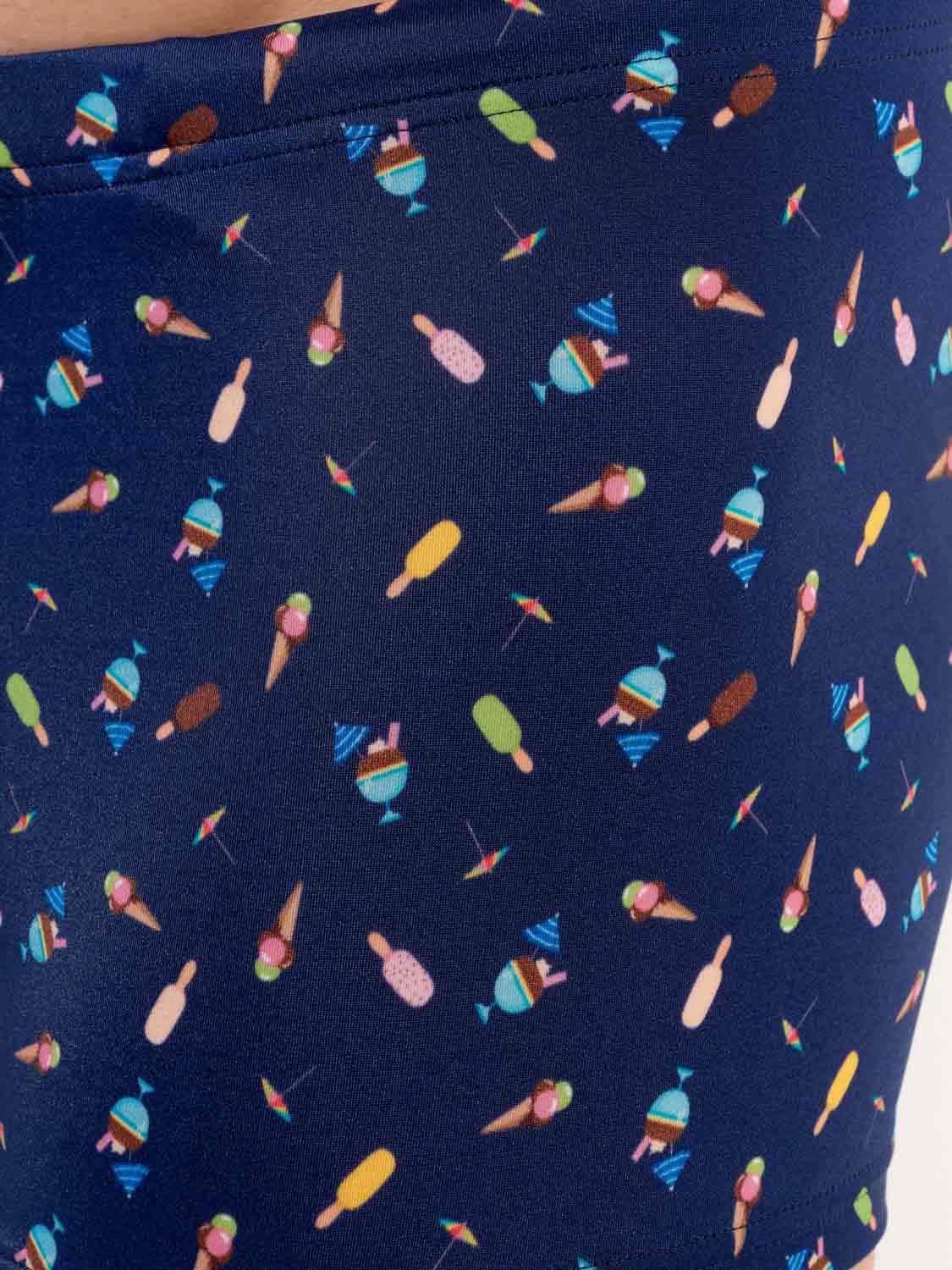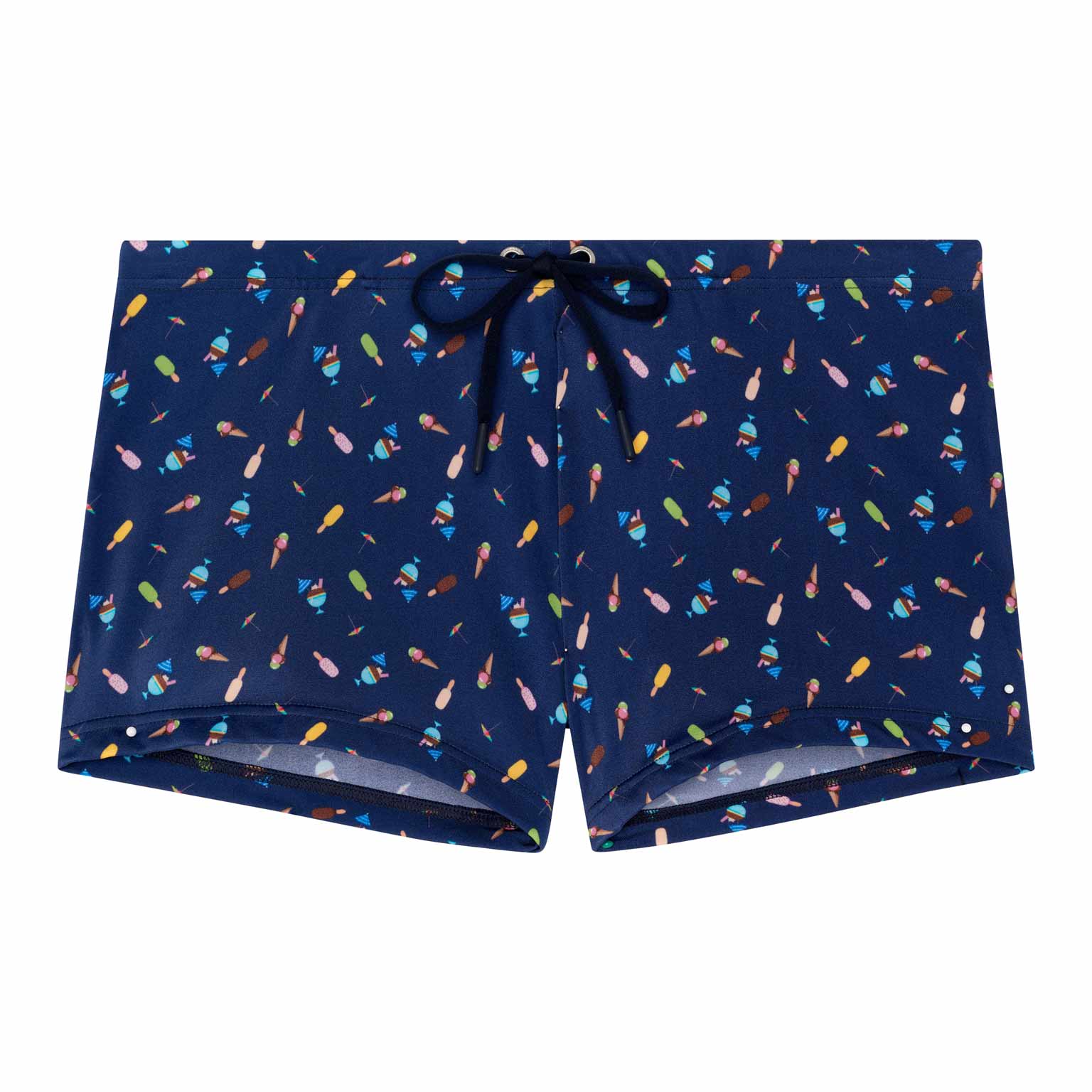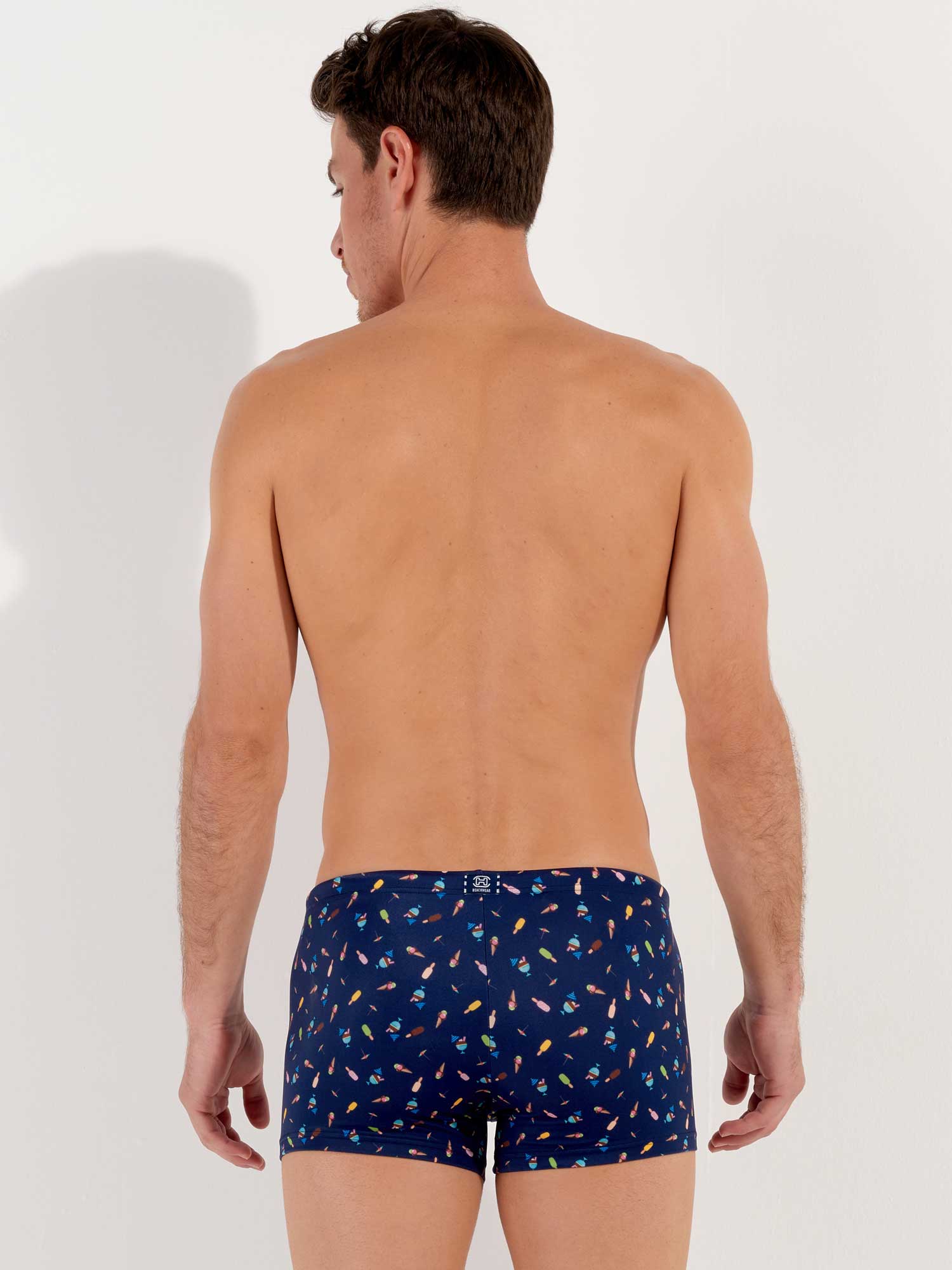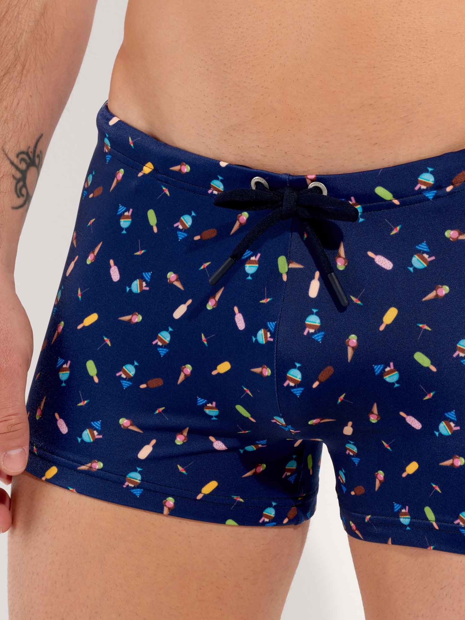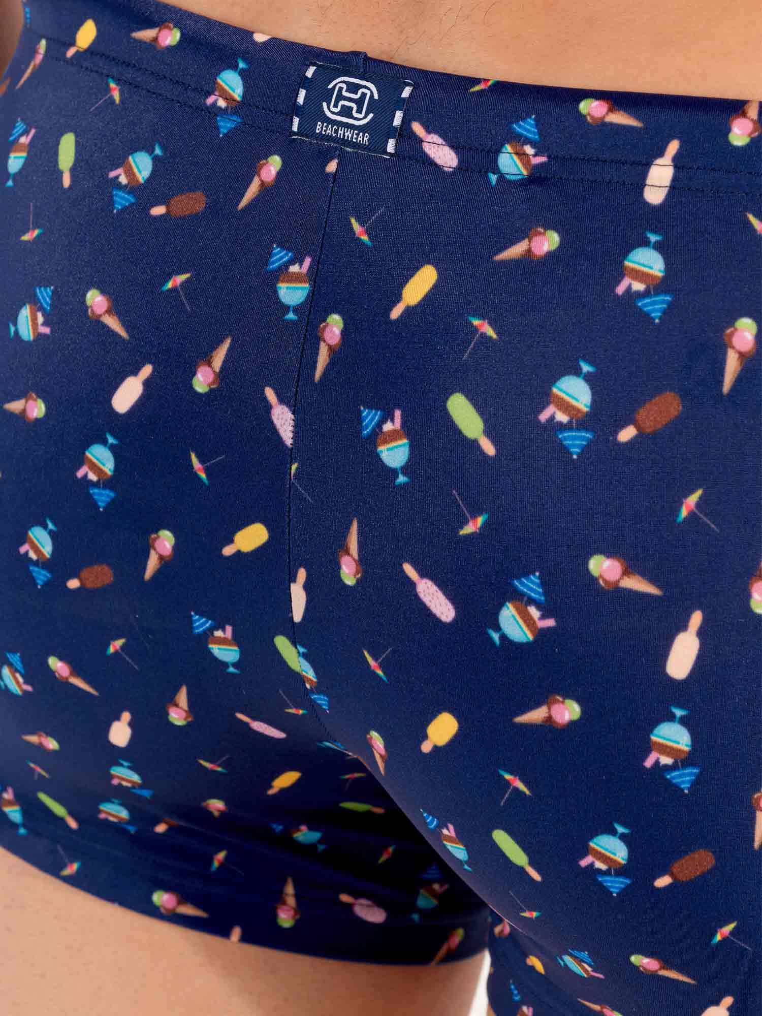 Le modèle Summer - Swim Shorts fait partie de la collection de maillots de bain d'été de HOM. L'imprimé représente des glaces colorées sur un fond bleu marine, évoquant la douceur et la légèreté des vacances d'été. Le tissu est élastique, s'adapte bien à la peau et n'est pas transparent. Le cordon de serrage à la taille permet d’ajuster parfaitement le short à votre taille pour un maintien sûr. Avec cet article de mode, apportez une touche de gaieté à la plage ou à la piscine.