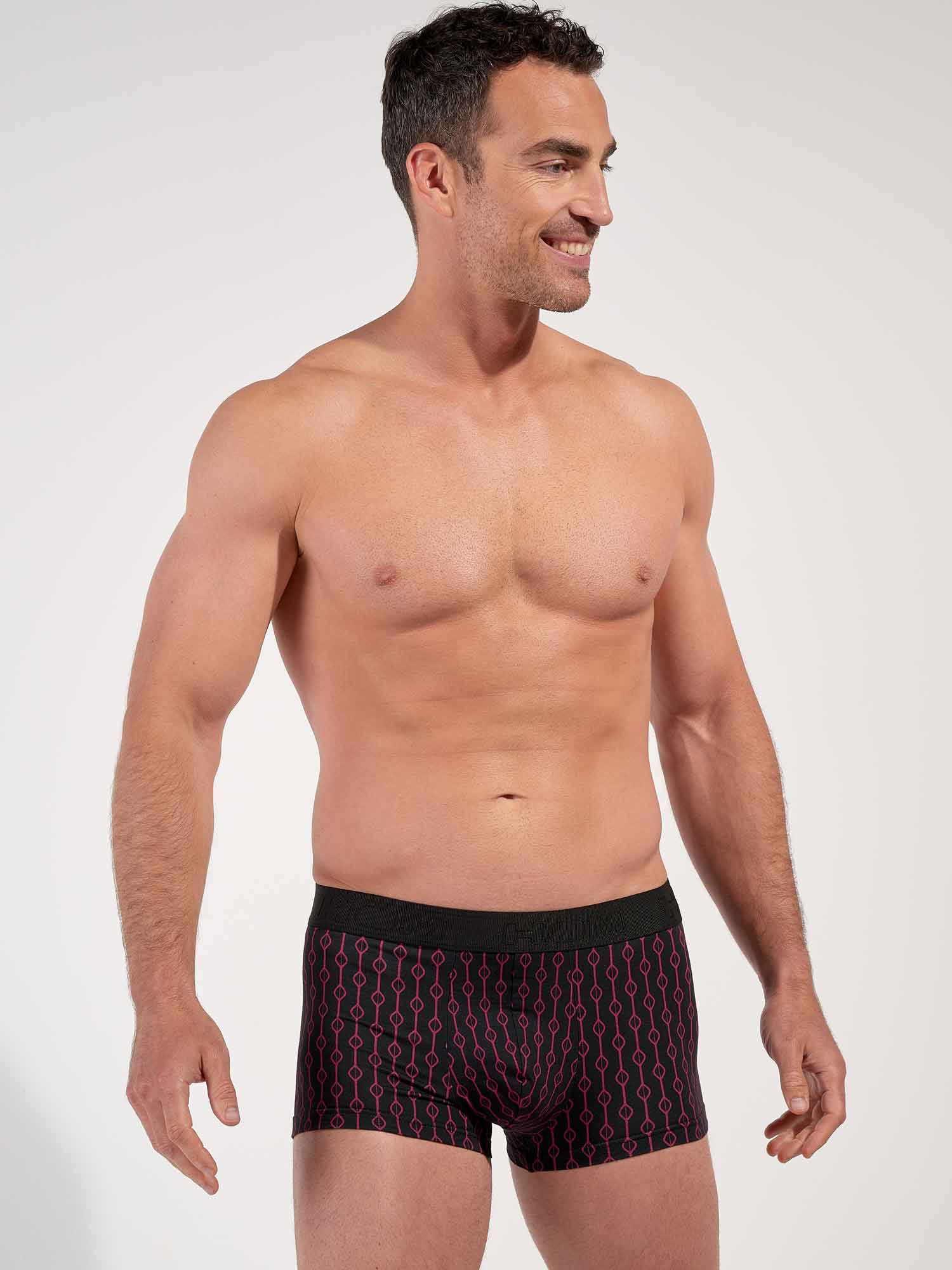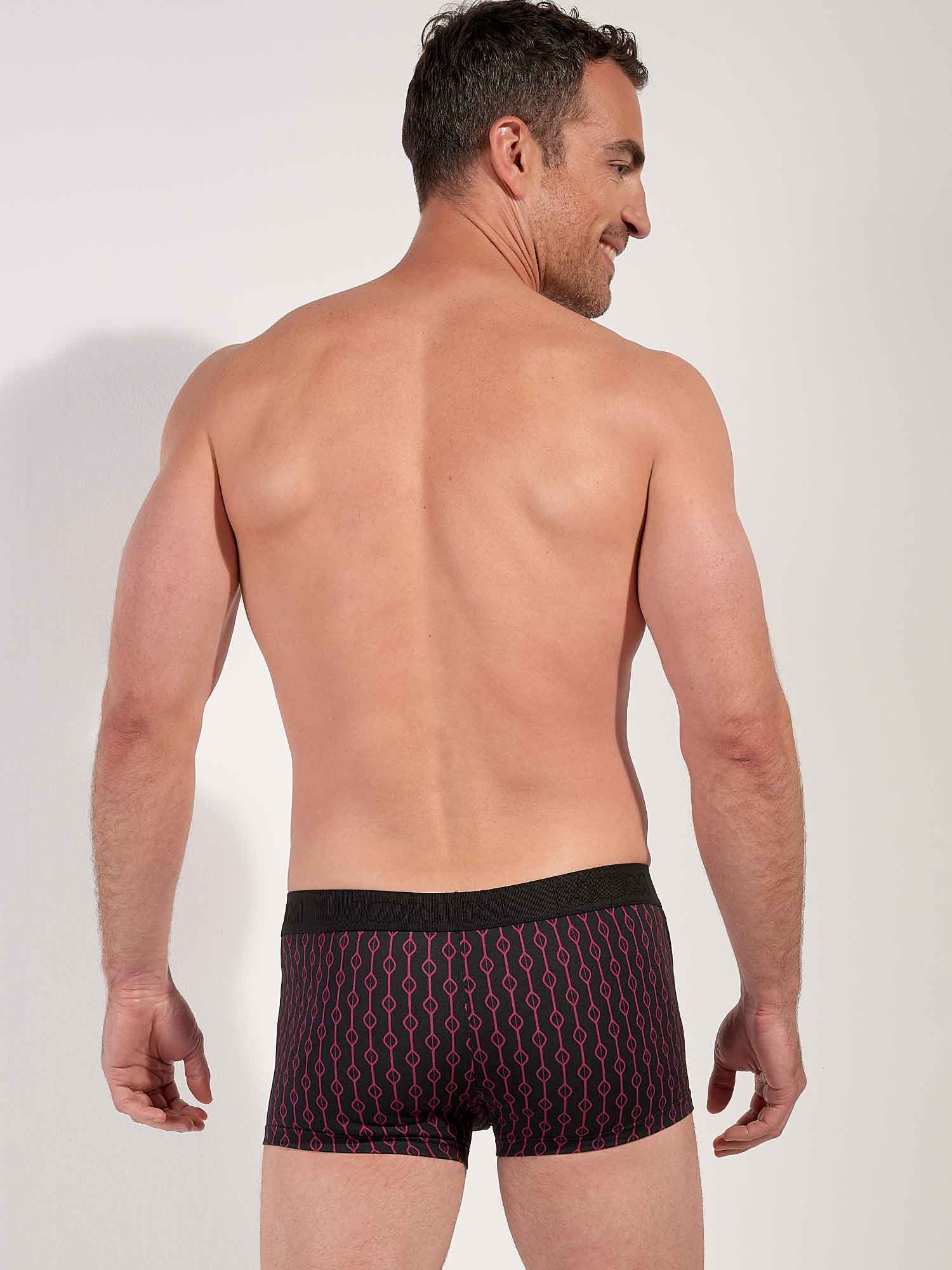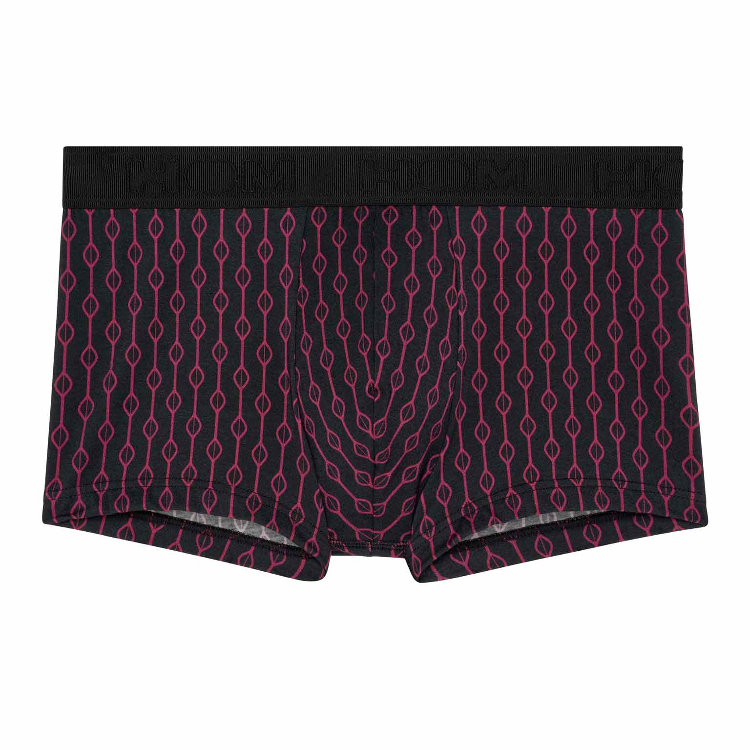 Le Dunes Trunk s’inspire de l’élégance rétro de Las Vegas avec un design géométrique raffiné dans l’esprit des années 50. Les formes bordeaux sur fond noir profond évoquent le glamour feutré du légendaire hôtel Dunes. Sa coupe trunk courte se place haut sur la cuisse pour une silhouette moderne et une liberté de mouvement optimale. La ceinture douce siglée HOM et l’empiècement élastiqué discret au bas de jambe aident à garder le maintien net toute la journée.