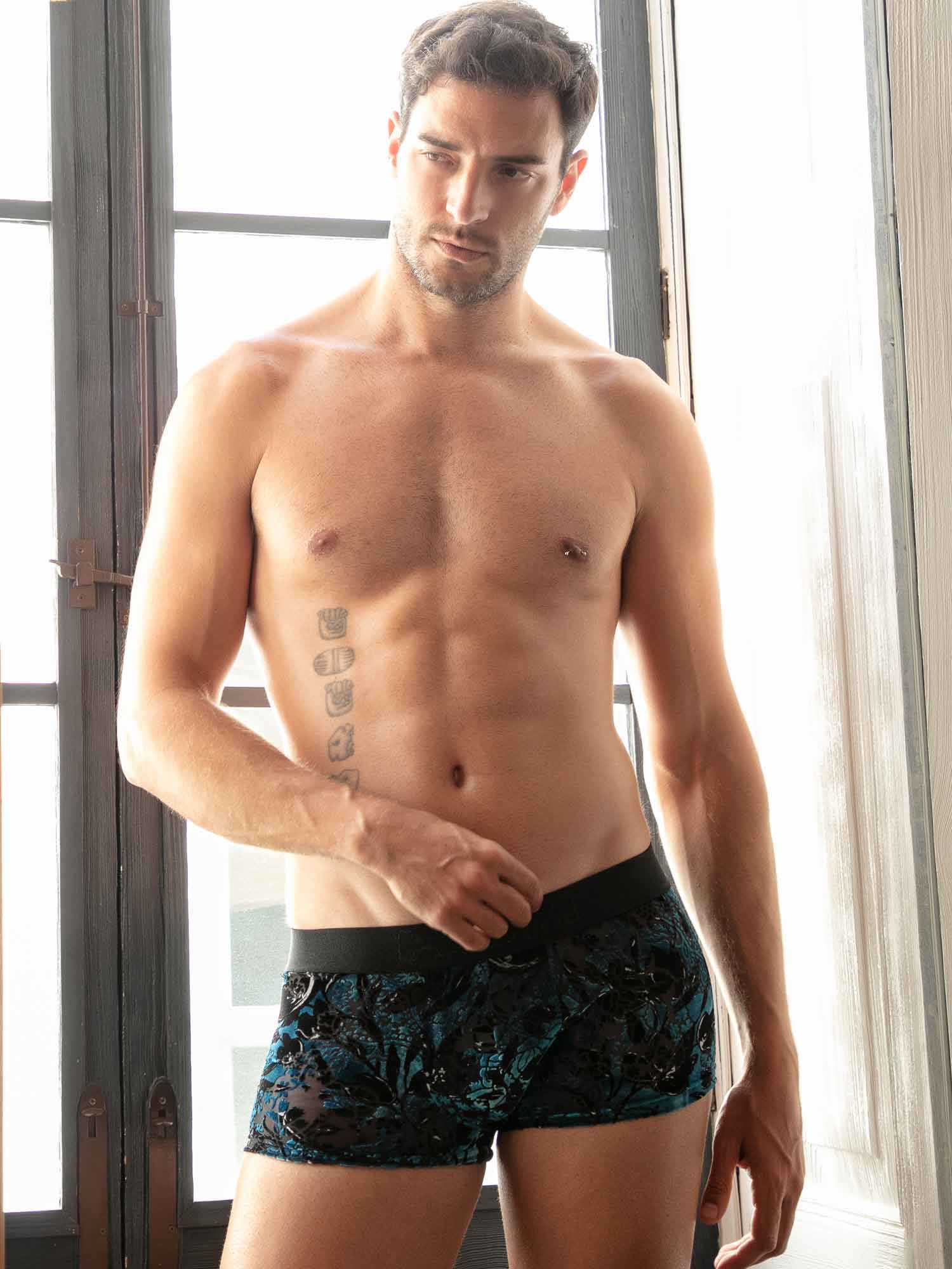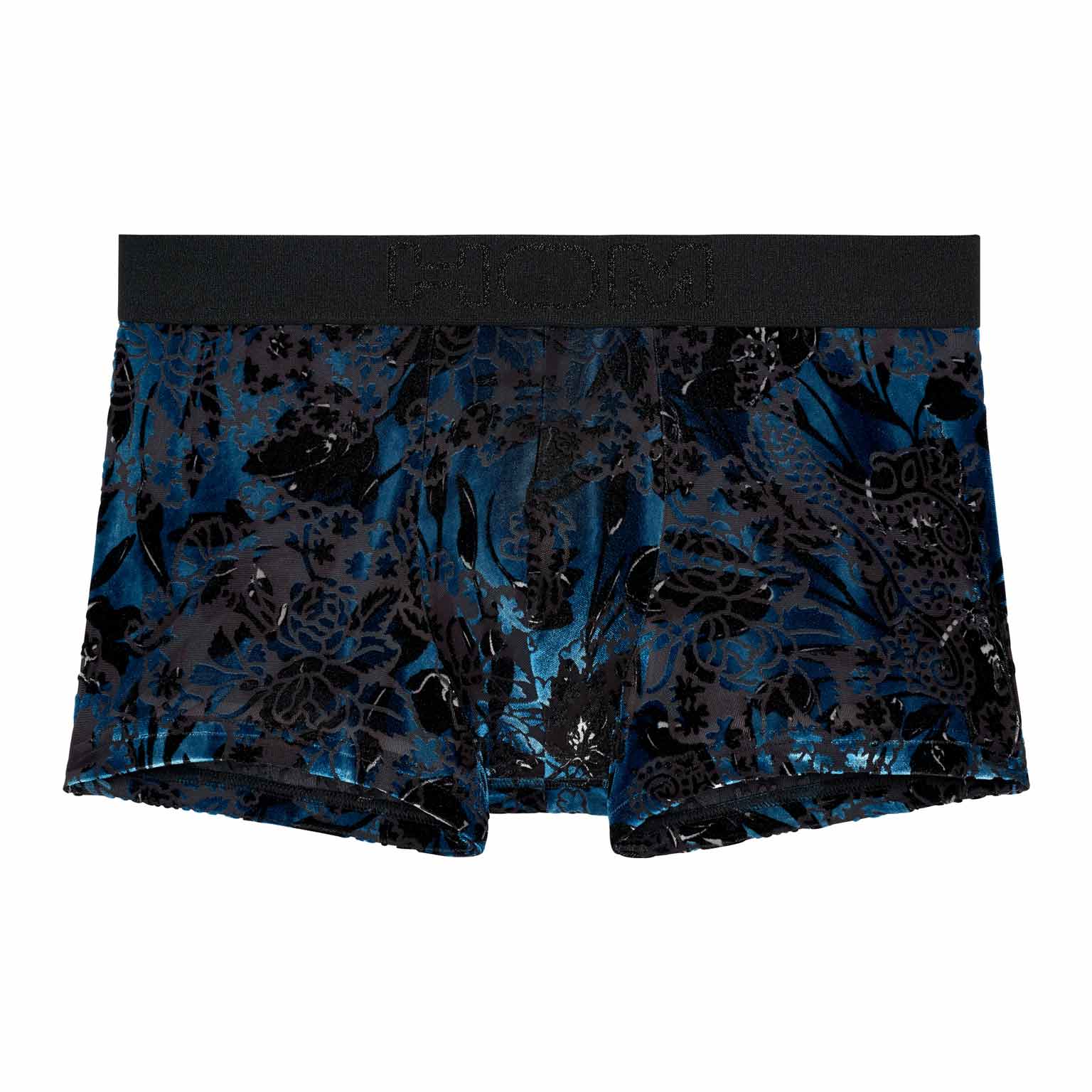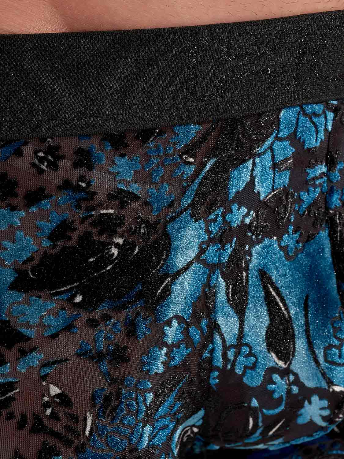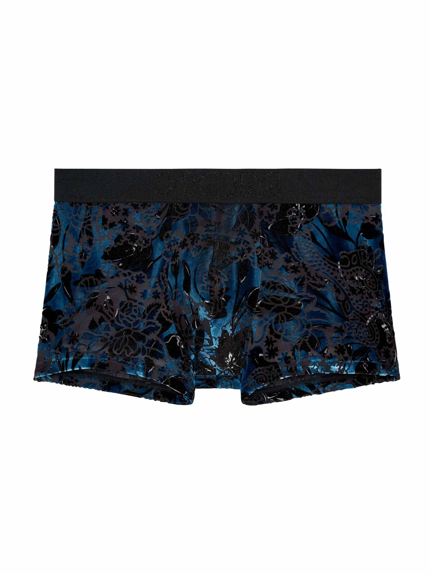 Le trunk HOM Fremont est la définition même de Temptation, réalisé en velours dévoré au toucher soyeux, qui capte la lumière grâce à son motif élégant d’inspiration baroque. Sur une base noire profonde, des accents bleu électrique et un léger scintillement rappellent les néons de Las Vegas, audacieux, tout en restant résolument raffiné. Avec son détail de jambe semi transparent et sa doublure frontale confortable, ce trunk dessine une silhouette assurée avec un confort luxueux. La ceinture douce est parachevée par un logo HOM centré en lurex pour une finition parfaite.