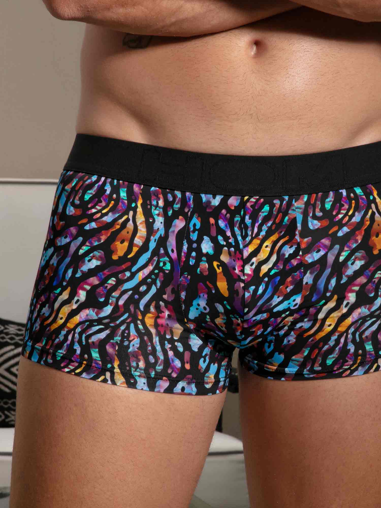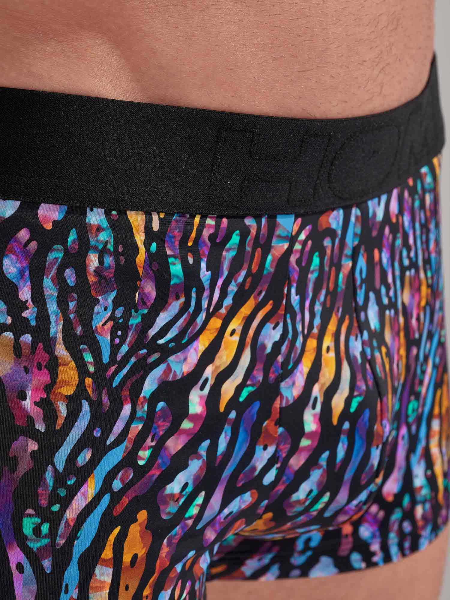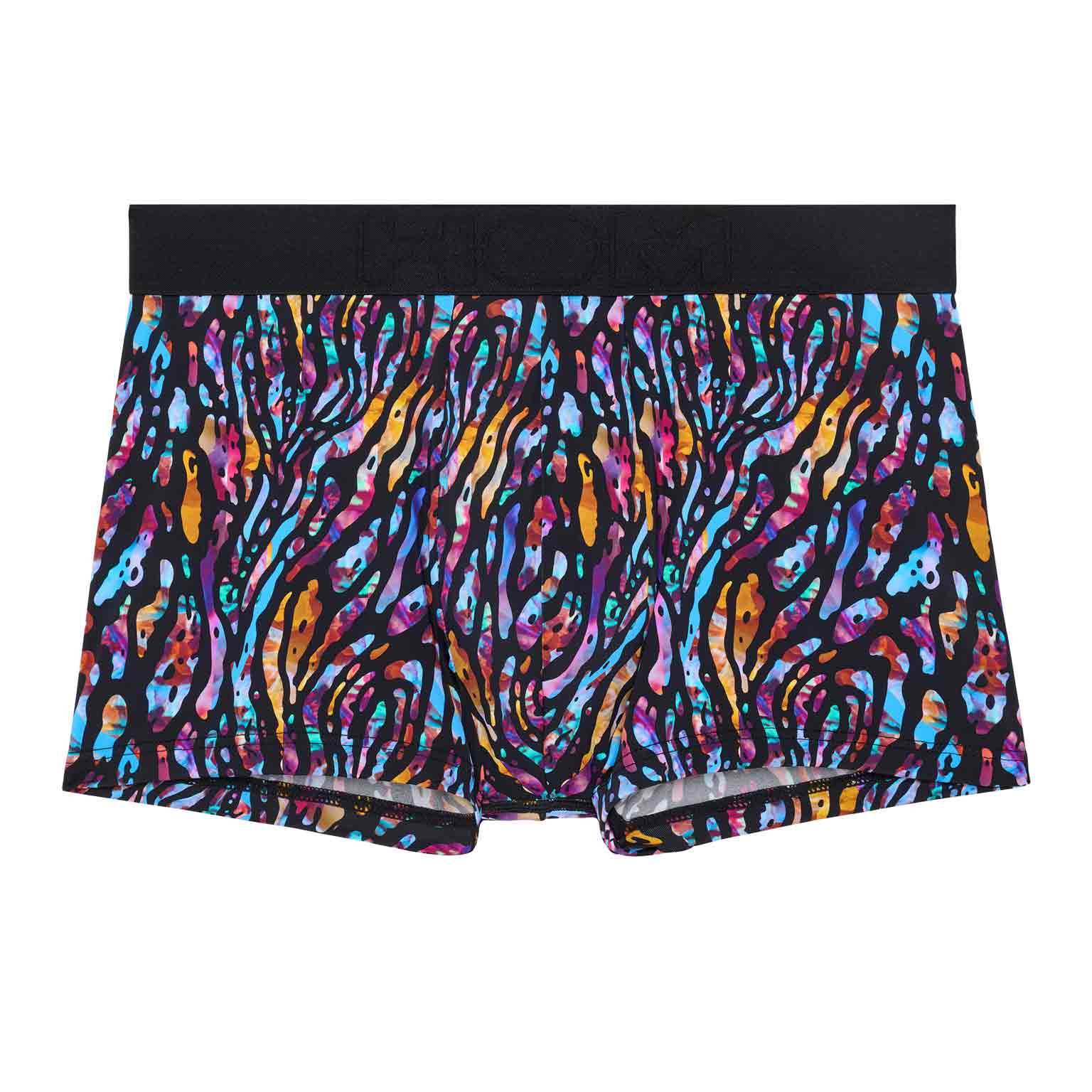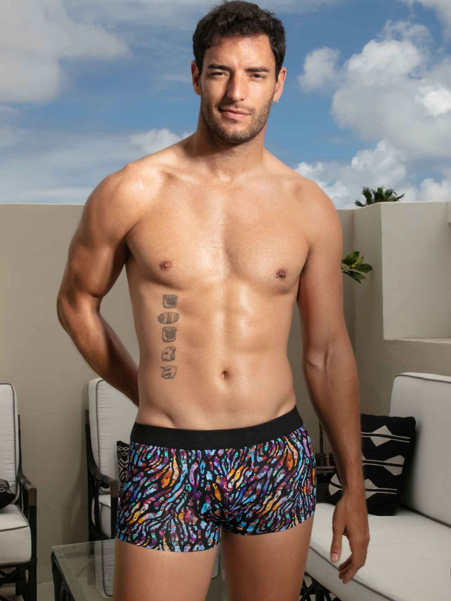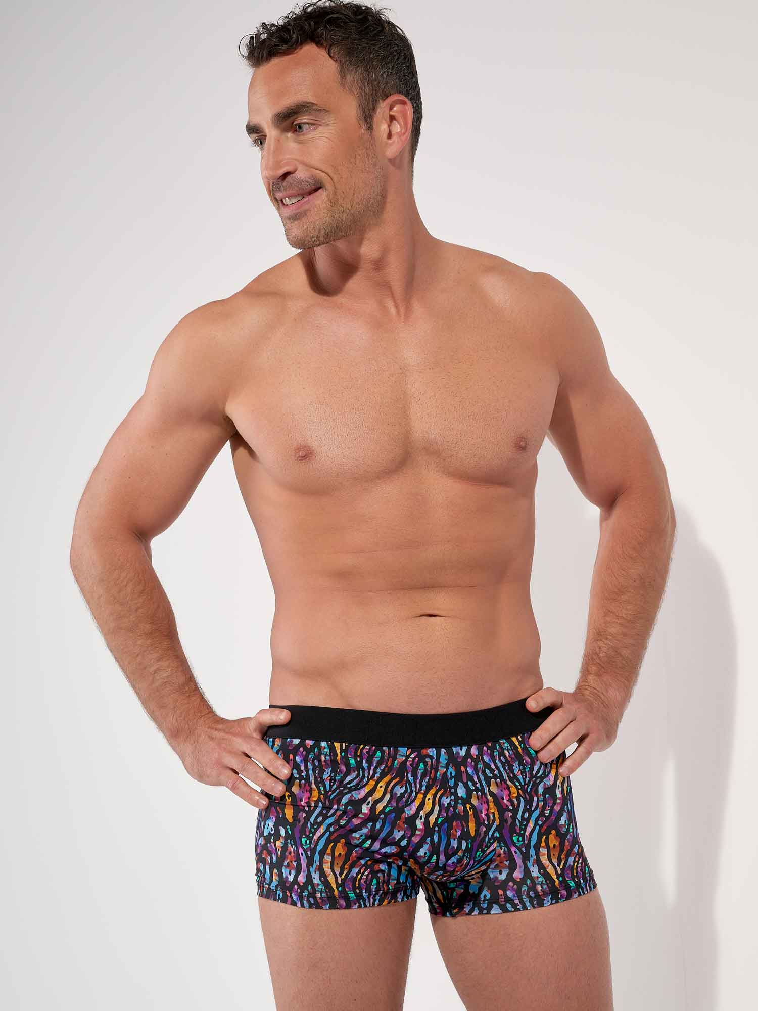 Le Miami Trunk apporte une énergie tropicale dans une coupe moderne et fonctionnelle. Sa forme courte se place haut sur la cuisse, pour une allure dynamique et une grande liberté de mouvement. Le design associe un motif animal noir stylisé à un fond très coloré inspiré de la jungle, il évoque les teintes et le rythme d’une flore et d’une faune exotiques. La ceinture HOM sans couture assure un maintien stable sans comprimer ni rouler, tandis que l’empiècement élastiqué discret intégré au bas de jambe aide à garder le trunk bien en place, pour une ligne nette et un confort durable. Avec son étiquette d’entretien détachable, il reste doux sur la peau du matin au soir.