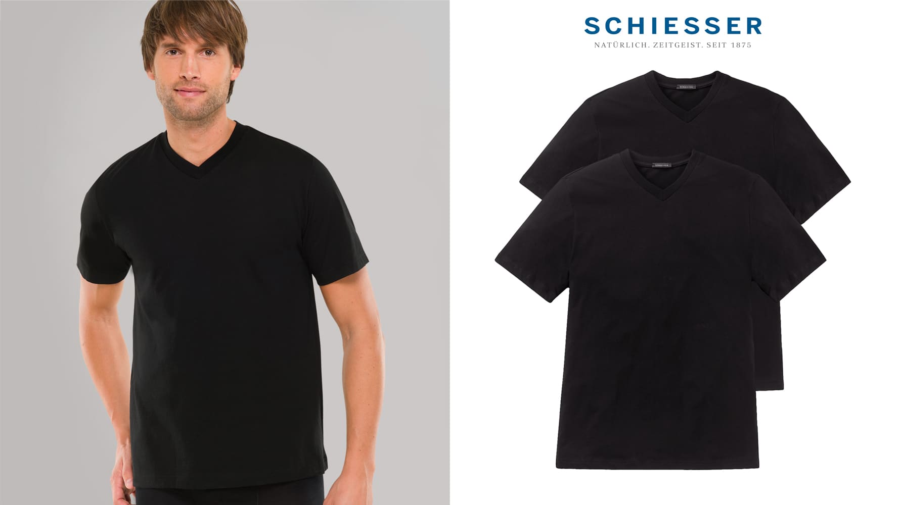 Lot de 2 T-Shirts qui font parties de la collection 'Essentials' de SCHIESSER. Les sous-vêtements casuals de cette ligne sont toujours réalisés en qualité Single Jersey délicat donc ils sont particulièrement doux et confortable à porter. Les shirts sportifs ont une coupe décontractée, un col V et un petit logo de la marque sur le côté.