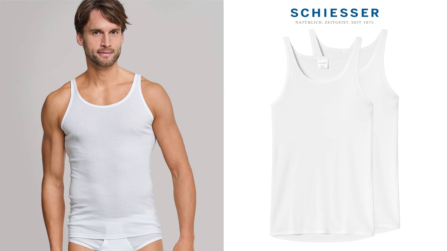 Lot de 2 maillots de corps 'Feinripp' qui font parties de la collection 'Classics' de SCHIESSER. Les sous-vêtements de cette ligne sont réalisés en 100% coton peigné de qualité supérieure: ils sont particulièrement doux au toucher et ils ont une coupe parfait qui garantit un confort optimal. Les maillots de corps Feinripp, avec leurs dos un peu plus longs et sans couture latérale gênante, sont disponible en blanc.